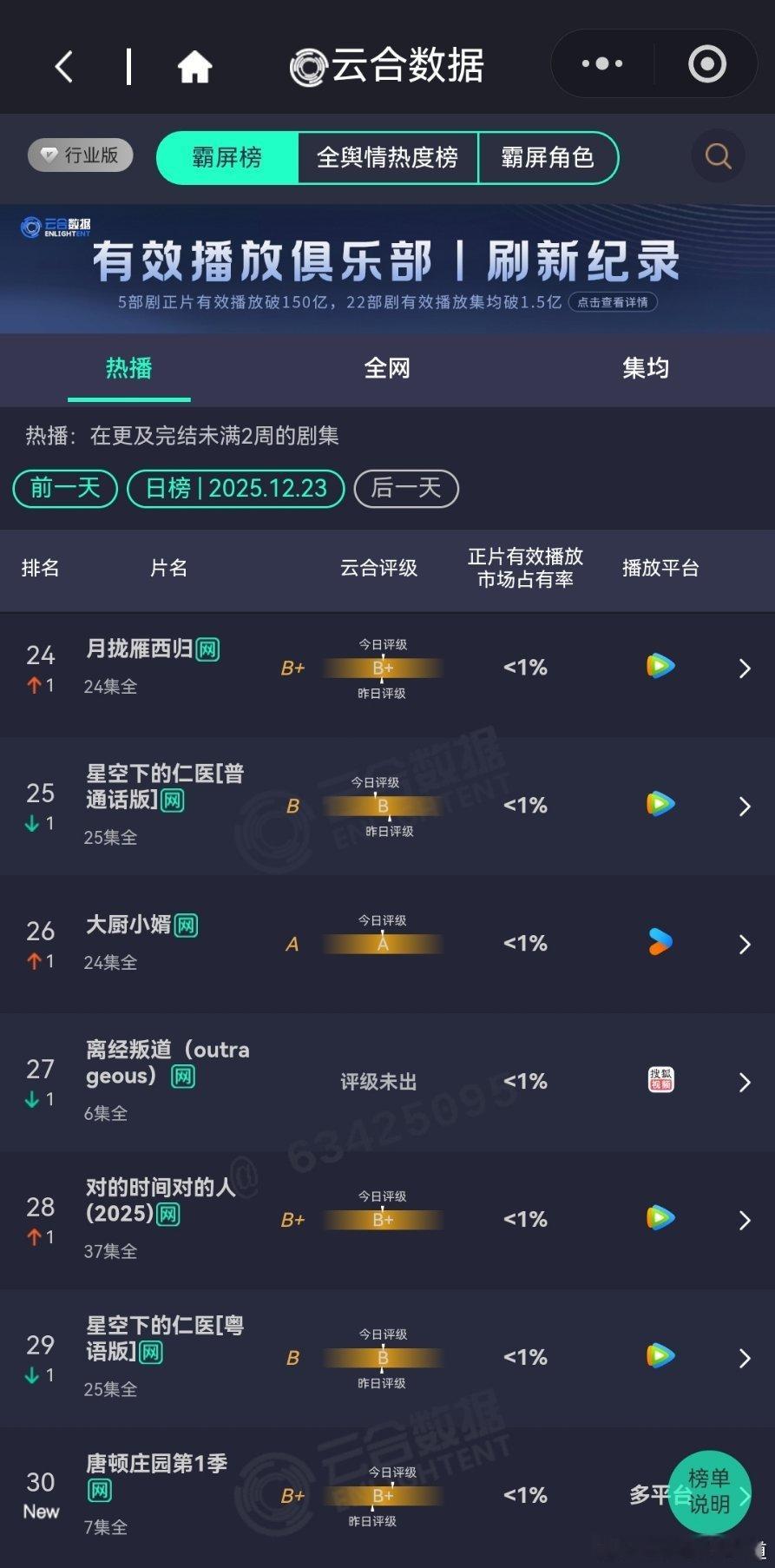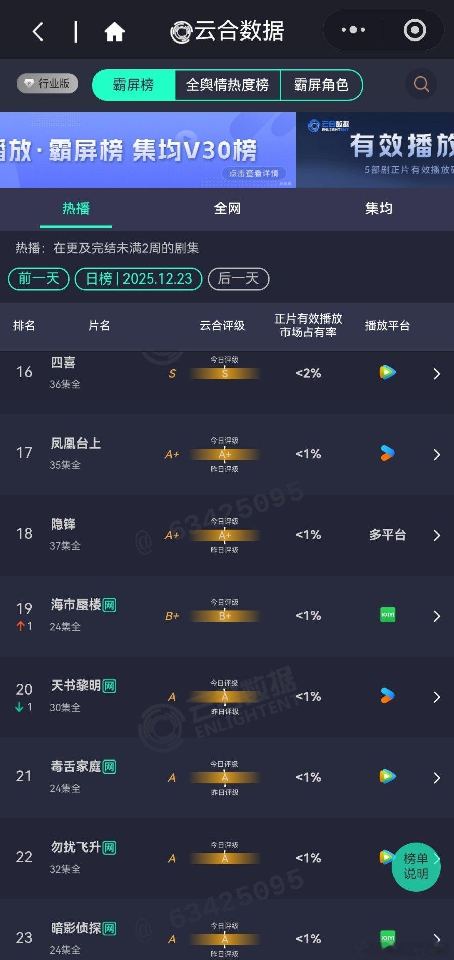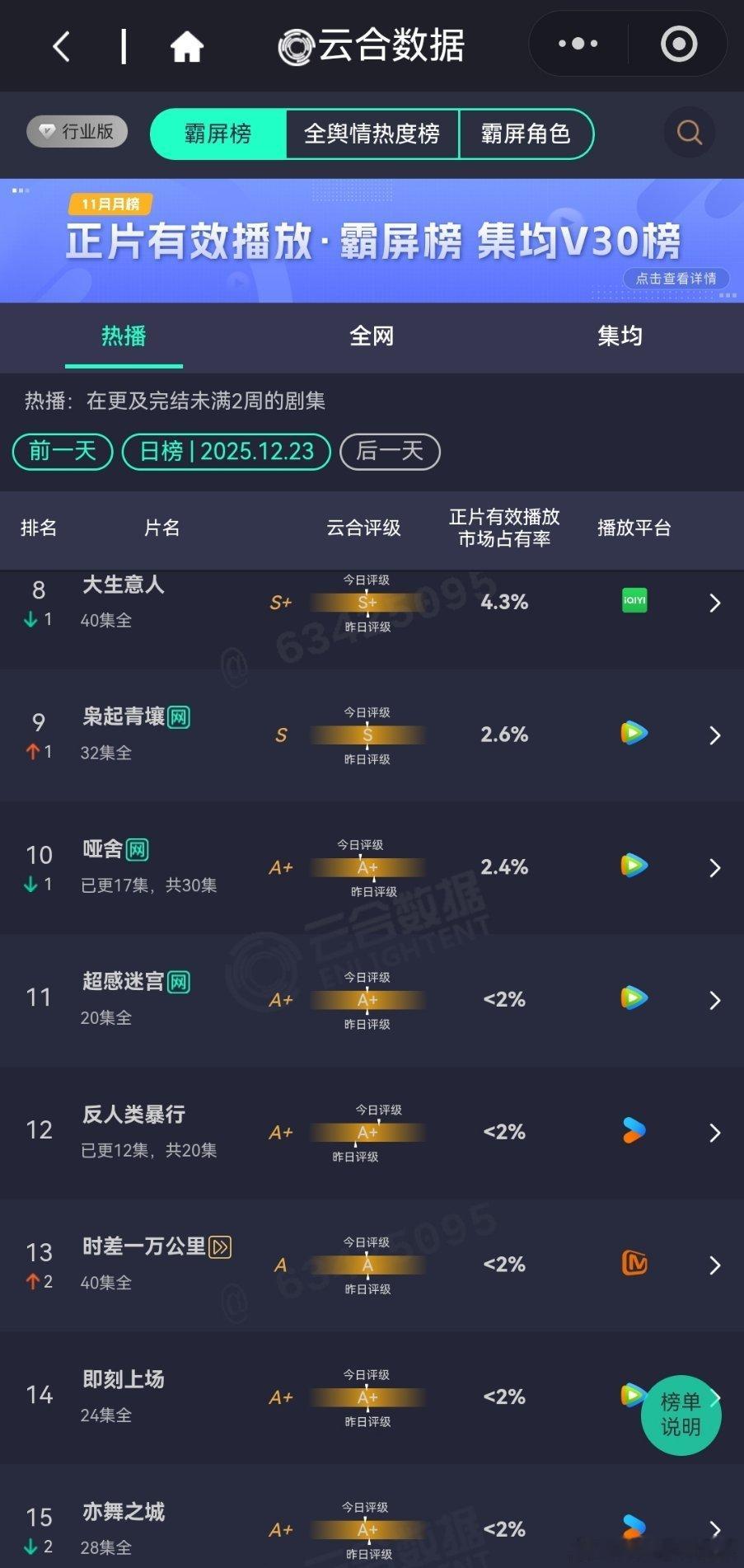 12月23日云合播放占比云合 老舅24.9%依旧是榜首,但是评级下降了,好在横在高位。长安二十四计12%无所谓,反正云合已经被开除了。骄阳似我云合11.1%差一点就翻倍成功了,不过趋势看着还是可以的。双轨9.4%降得有点快。风与潮8%苟住