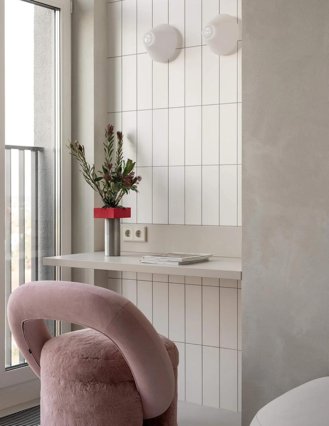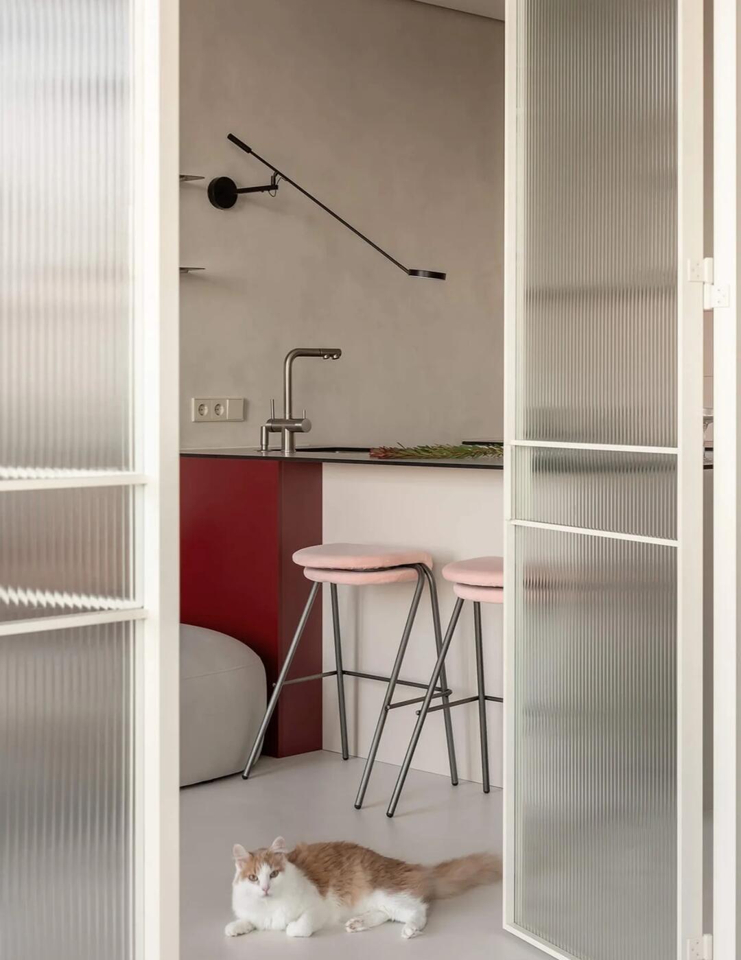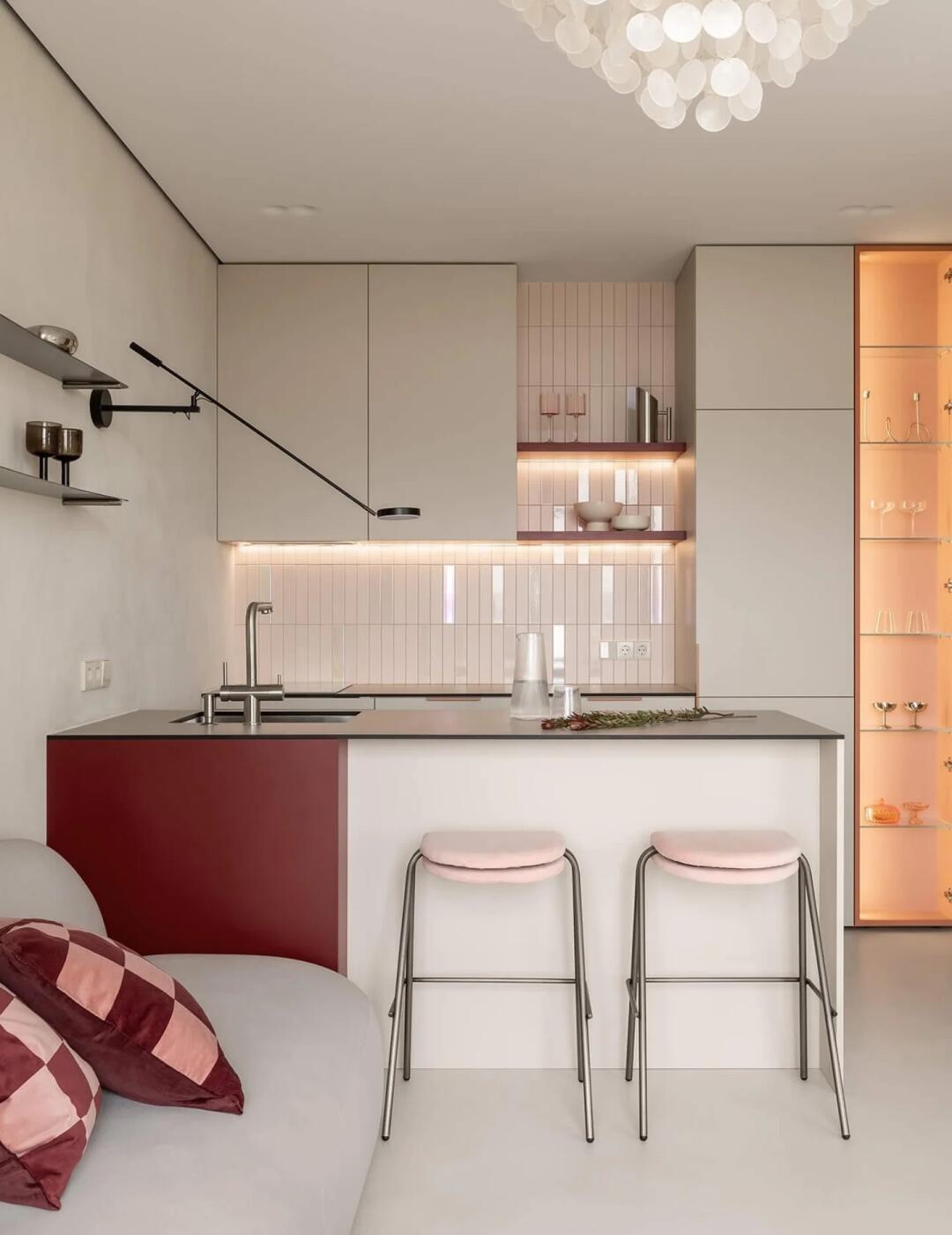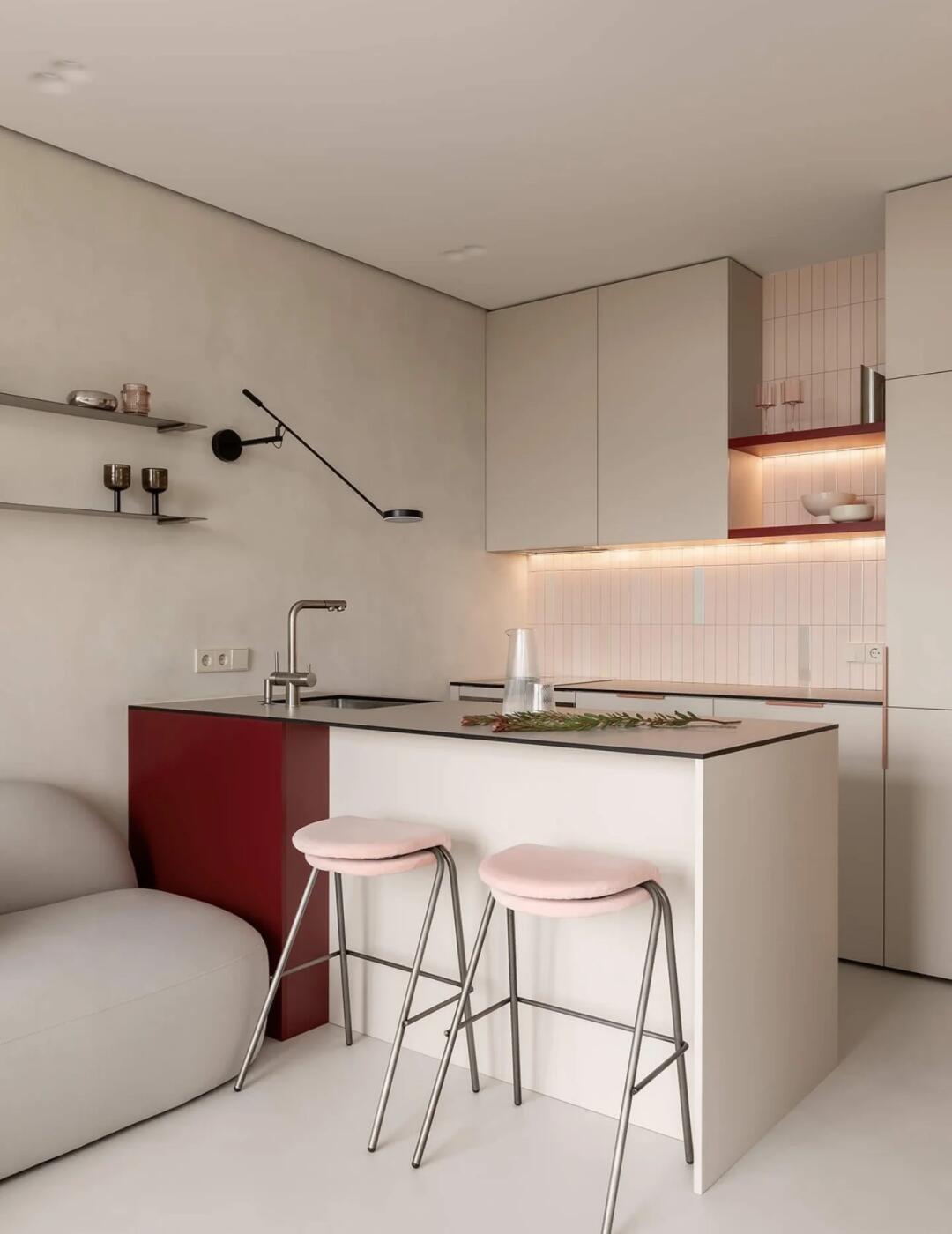 No.1349|一万个公寓灵感 白色自流平地面搭配米灰色墙漆和白色天花板,让小公寓仿佛一张白纸等待设计师的挥毫泼墨,厨房里白色橱柜搭配深灰色台面简单大气,上方同色吊柜扩大收纳空间,吊柜旁的双层红色搁板十分吸睛,用于陈列各式器皿摆件,为小空间带来烟火气中的浪漫,墙上粉色瓷砖易于清洁的同时让小厨房更加温柔,搭配暖色调顶灯氛围感满满,白色与红色的拼色岛台扩大操作台面,一侧台面向外伸出,搭配粉色高脚凳用作吧台,值得小空间借鉴。 @vlad_martens @ukrainian_interior_design 居住趋势 超棒的装修决定 一人居设计 冬日好好宅 居住趋势 家居博主 装修灵感 软装搭配 审美积累 生活方式 浪漫生活的记录者 搞的就是艺术 设计师的家 家居薯 光是一切氛围感的源头 我心爱的小角落 每秒都值得记录 把生活拍成电影 万般滋味皆是生活 在平凡里热爱生活 听见日子翻页的声音 在这周而复始的日子里寻找乐趣 你要去观世界才会有世界观 不要辜负好天气 生活里的讲究学 我的装修日记 超棒的装修决定 我若拿出这张图阁下如何应对 生来热烈而自由 大大方方做自己 更好的自己 今日快乐今日发 只是为了几个瞬间 拍拍身边烟火气 当然要记录啊 DIY 家居DIY 手工 家居配色 家居配色灵感 北欧风 北欧风装修 小木屋 林中小屋 小木屋装修 小街小巷收集器 大自然专治所有不开心