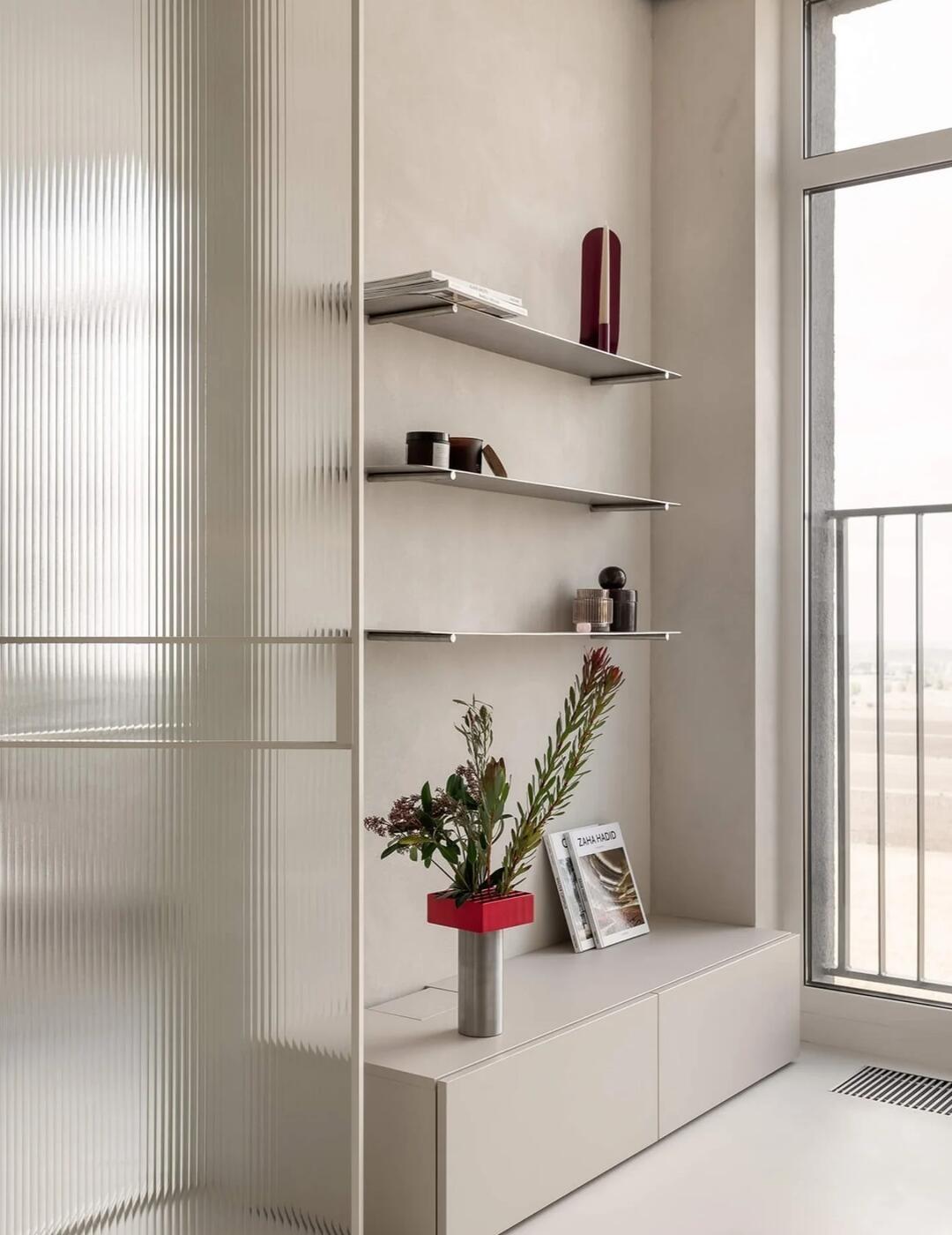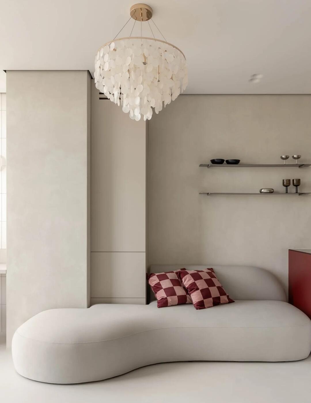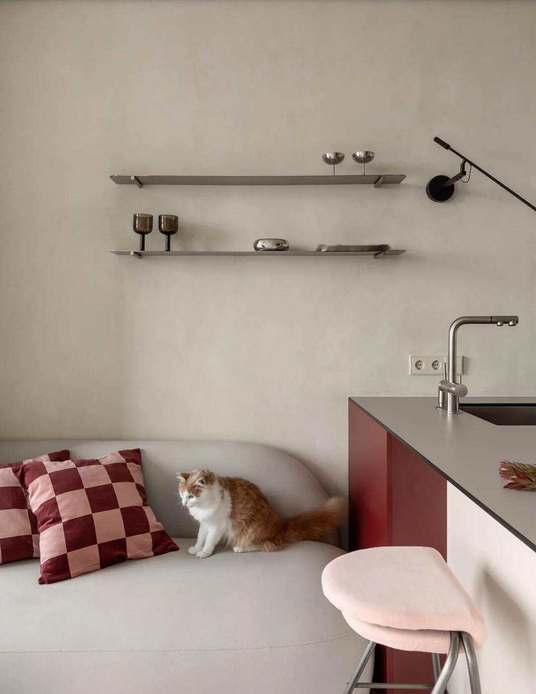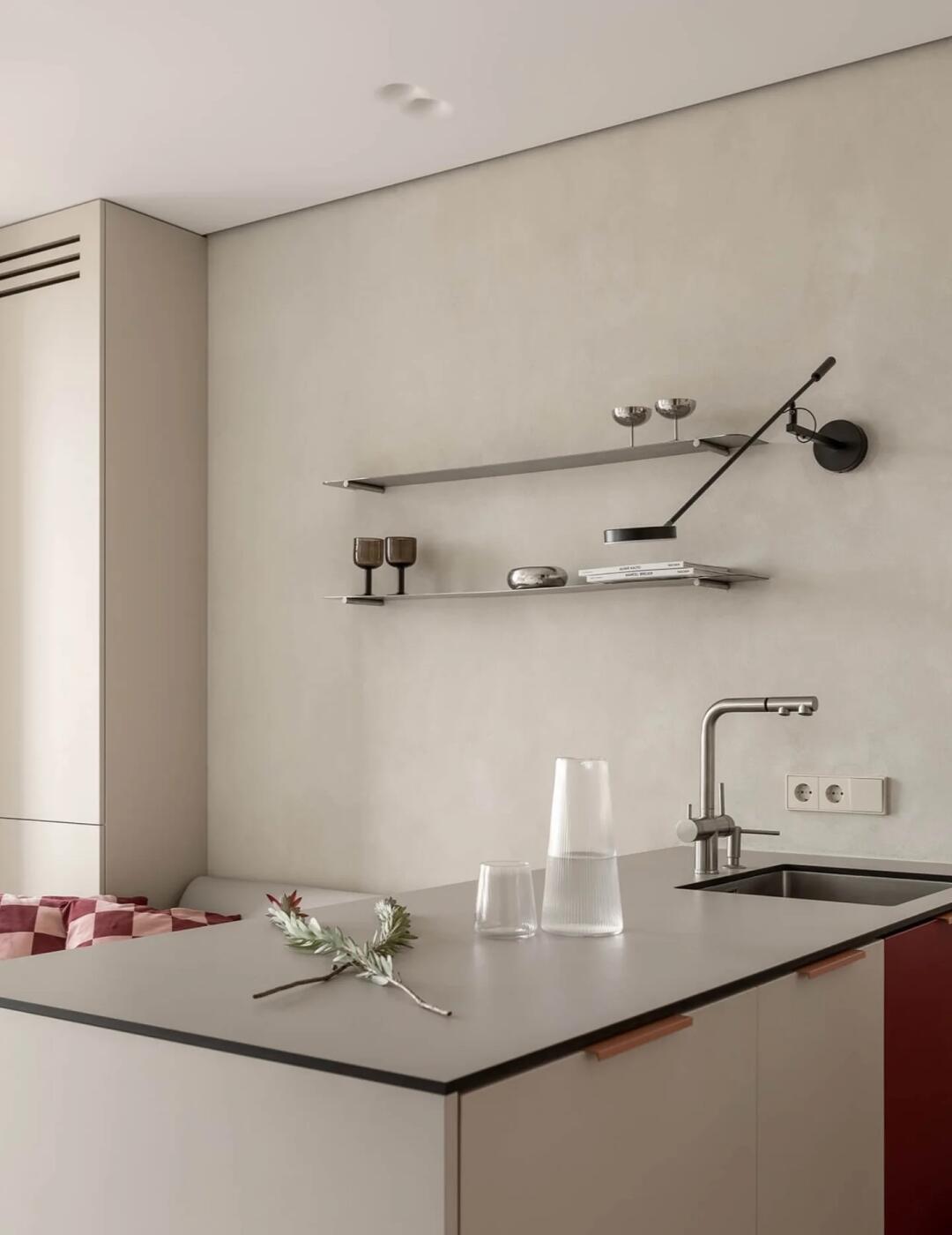 No.1349|一万个公寓灵感 白色自流平地面搭配米灰色墙漆和白色天花板,让小公寓仿佛一张白纸等待设计师的挥毫泼墨,厨房里白色橱柜搭配深灰色台面简单大气,上方同色吊柜扩大收纳空间,吊柜旁的双层红色搁板十分吸睛,用于陈列各式器皿摆件,为小空间带来烟火气中的浪漫,墙上粉色瓷砖易于清洁的同时让小厨房更加温柔,搭配暖色调顶灯氛围感满满,白色与红色的拼色岛台扩大操作台面,一侧台面向外伸出,搭配粉色高脚凳用作吧台,值得小空间借鉴。 @vlad_martens @ukrainian_interior_design 居住趋势 超棒的装修决定 一人居设计 冬日好好宅 居住趋势 家居博主 装修灵感 软装搭配 审美积累 生活方式 浪漫生活的记录者 搞的就是艺术 设计师的家 家居薯 光是一切氛围感的源头 我心爱的小角落 每秒都值得记录 把生活拍成电影 万般滋味皆是生活 在平凡里热爱生活 听见日子翻页的声音 在这周而复始的日子里寻找乐趣 你要去观世界才会有世界观 不要辜负好天气 生活里的讲究学 我的装修日记 超棒的装修决定 我若拿出这张图阁下如何应对 生来热烈而自由 大大方方做自己 更好的自己 今日快乐今日发 只是为了几个瞬间 拍拍身边烟火气 当然要记录啊 DIY 家居DIY 手工 家居配色 家居配色灵感 北欧风 北欧风装修 小木屋 林中小屋 小木屋装修 小街小巷收集器 大自然专治所有不开心