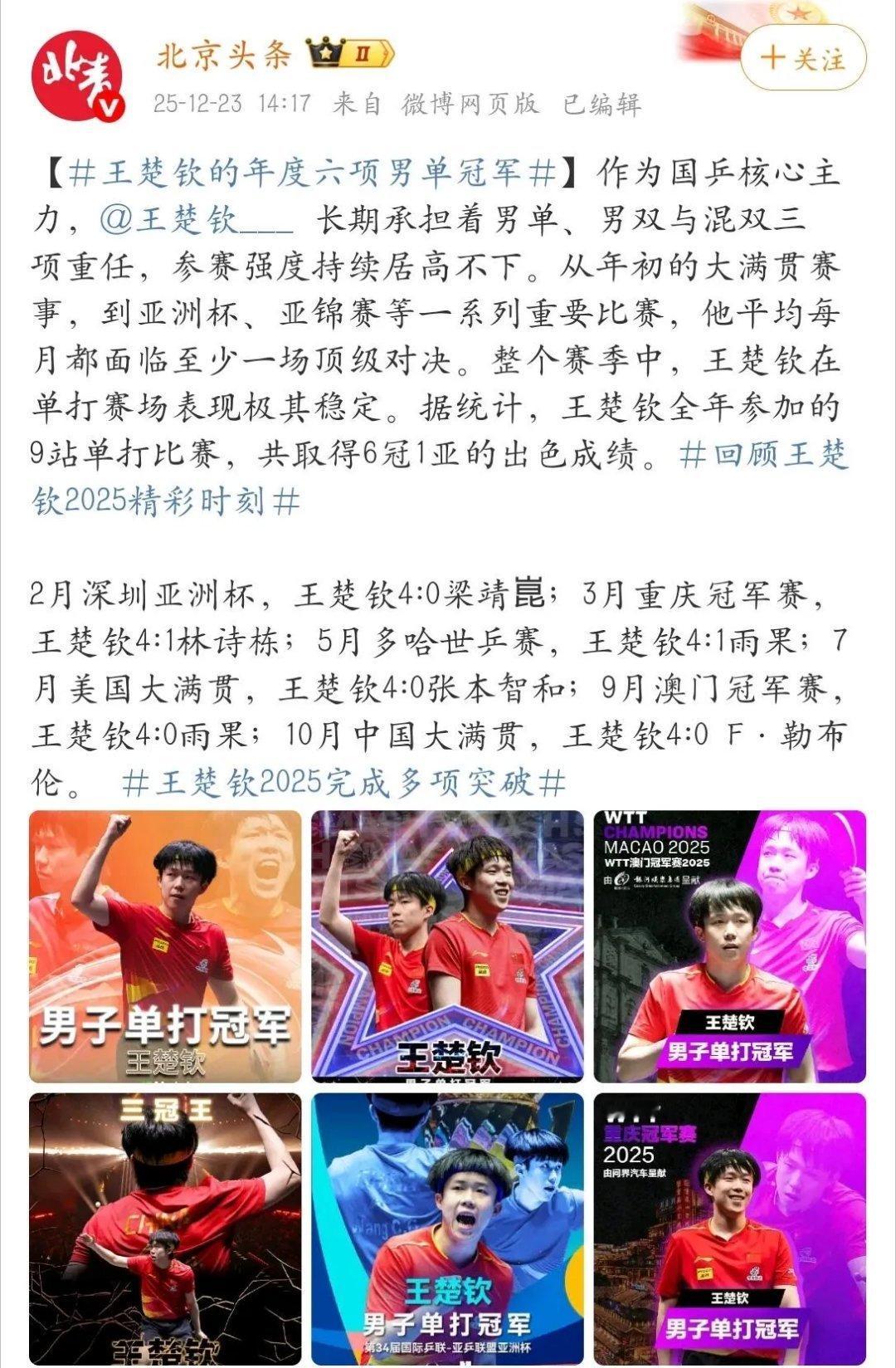突破的25年,猛猛进攻的26年,值得期待的26岁,头哥厉害,回头看已经拿了那么多项冠军!王楚钦站稳了位置,国乒的一哥,现在多项都是他打头阵,他扛下来了,这才是真的优秀的,每一次都是自己的教练,突破自我,这次的总结是正常的鼓励的报道,多多发,一起加油进步!体育大赏微博年度能量人物体坛高能时刻