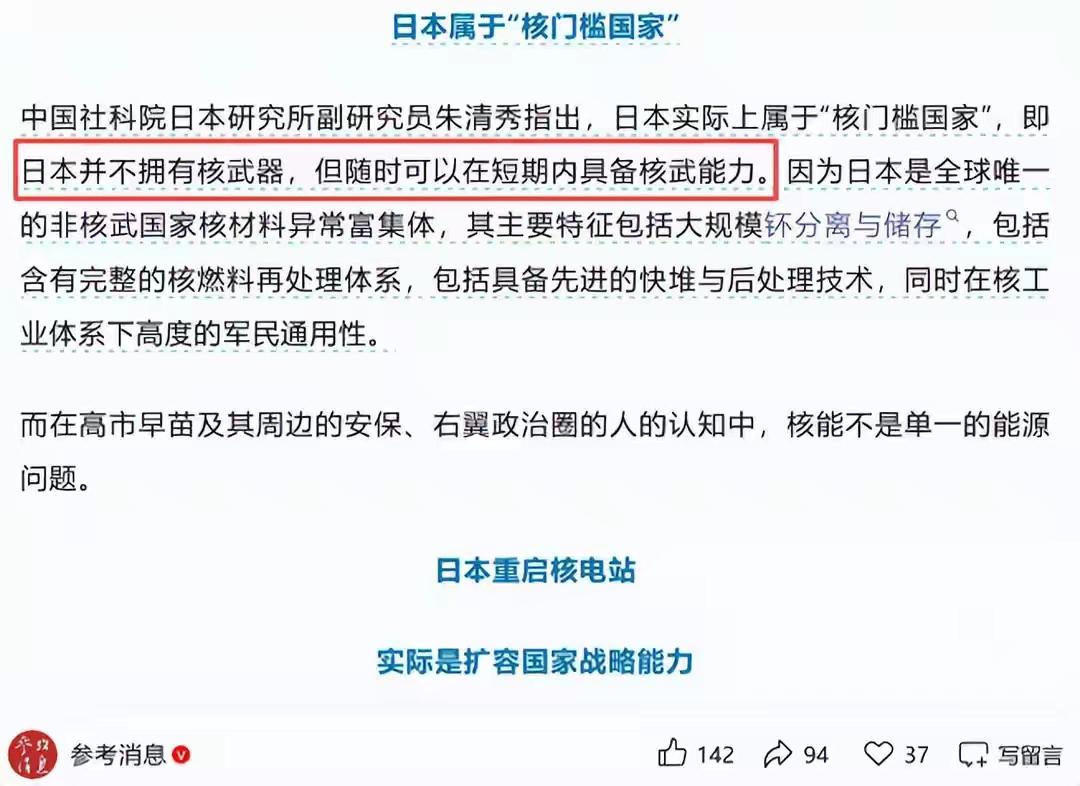 日本又出现核泄漏了,中国社科院警告,日本可在短期内造出核武器 近日,日本再次成为国际关注的焦点。据多方消息显示,日本境内出现了核泄漏事件,引发了广泛的担忧和热议。这一事件不仅让人担心环境安全,更让人联想到日本在核技术方面的敏感话题。与此同时,中国社科院的专家发出警告:在当前局势下,日本或许有能力在短期内研发出核武器。这一说法,犹如一颗重磅炸弹,激起了国内外的轩然大波。 日本,作为二战后唯一一个遭受原子弹轰炸的国家,其核政策一直处于敏感且复杂的状态。此次核泄漏事件,无疑让人再次思考:日本是否在秘密推进核武器的研发?如果真如专家所言,日本具备短期内造出核武器的能力,那么全球安全局势将迎来巨大变数。这不仅关乎亚太地区的稳定,更关系到全球的战略平衡。 有人或许会问:“日本难道还会走上核武扩张的道路吗?”其实,这背后隐藏着更深层次的担忧。日本在经济、科技、军事方面的崛起,已经引起邻国的警惕。日本政府一直在追求“安全保障”,而核武器,似乎成为了某些极端势力心中的“终极保障”。但与此同时,核扩散带来的风险,也让国际社会不得不警惕:核技术的扩散,可能引发一场新的军备竞赛。 中国社科院的警告,提醒我们:核武器的研发,不仅是技术问题,更是政治和战略的抉择。短期内造出核武器的能力,意味着日本可能会在国际舞台上采取更为激进的姿态,甚至影响到地区乃至全球的安全格局。这种潜在的威胁,值得我们每一个人深思。 作为普通公众,我们或许无法直接影响国际局势,但可以从中看到:和平的来之不易。核问题,不仅仅是国家的“秘密武器”,更是人类共同的责任。我们希望,所有国家都能本着和平、合作的原则,避免走上不可逆转的核扩散道路。毕竟,核武器带来的,只有毁灭和恐惧,没有真正的安全。 你怎么看?对日本的核技术发展,你感到担忧还是相信国际社会能有效遏制?面对复杂的国际局势,我们又该如何保持理性与冷静?欢迎留言,分享你的看法,让我们共同关注这个关系到全球未来的大事。日本核武争议 日本要拥核