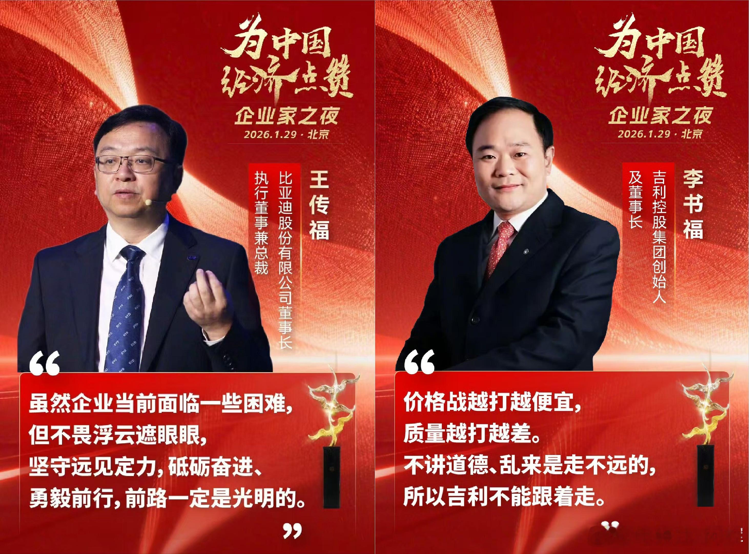 两位民营车企的掌舵人说的话都很有道理,都在讲企业的现状王传福语录:虽然企业当前面临一些困难,但不畏浮云遮眼眼,坚守远见定力,砥砺奋进、勇毅前行,前路一定是光明的。李书福语录:价格战越打越便宜,质量越打越差。不讲道德、乱来是走不远的,所以吉利不能跟着走。