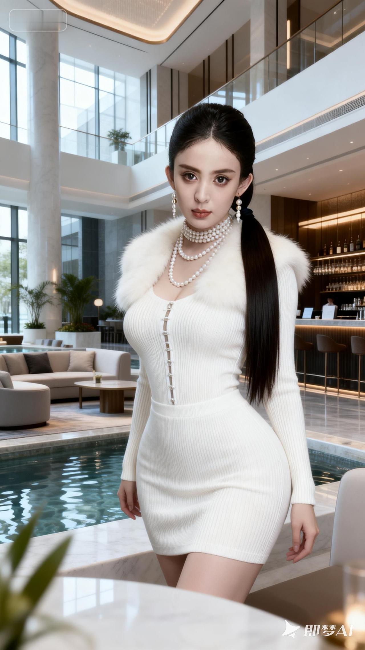 优雅气质,珍珠项链点缀,白色连衣裙,尽显奢华与时尚。