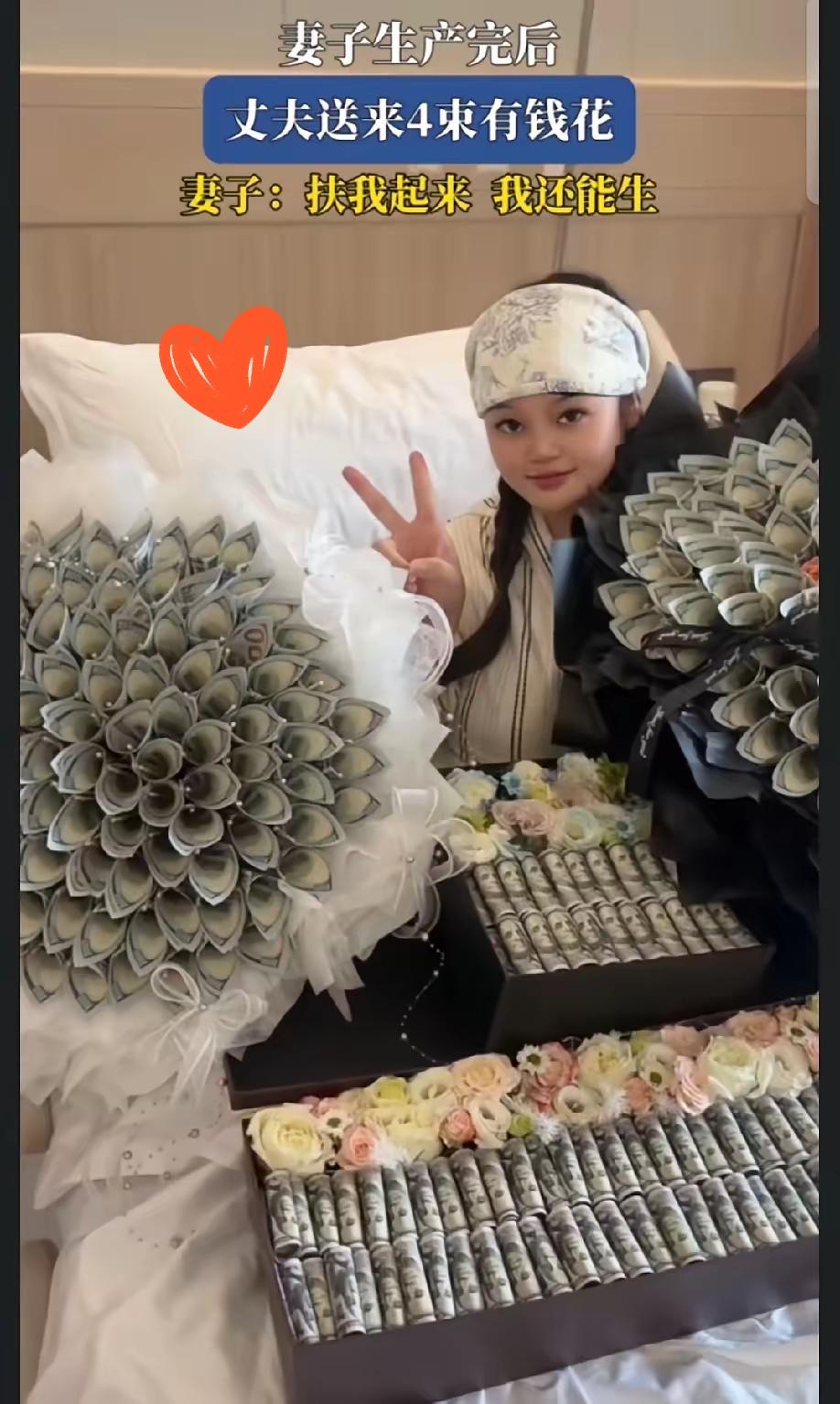 贫穷限制了想象!浙江,女子生完孩子后在月子中心休养,丈夫过来看她,带了一黑一白两束“花”。一般人生孩子收花不稀奇,可这花不一般,不是玫瑰也不是百合,全是美元折的 妻子捧着花笑得合不拢嘴,还打趣说扶她起来还能再生,这画面属实让人羡慕不已。 有人觉得这不过是自家钱换个形式,纯属多此一举,但其实大家都看错了核心,这份心意从来无关金钱本身,而是藏在用心背后的偏爱与认可。 女人生孩子的辛苦最需要被看见,比起冷冰冰的转账,把钱折成花的这份巧思,恰恰是丈夫把妻子的付出放在心上的最好证明。 仪式感从来都没有标准答案,天价美元花也好,一碗热汤、一夜陪护也罢,本质都是对身边人的用心回应。 真正的爱意从不是攀比形式,而是愿意为对方花心思的真心,这份看见与珍惜,才是感情里最珍贵的东西。你觉得表达爱意最好的方式是什么?评论区聊聊你的想法吧!