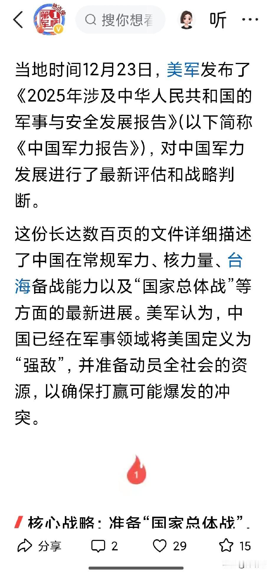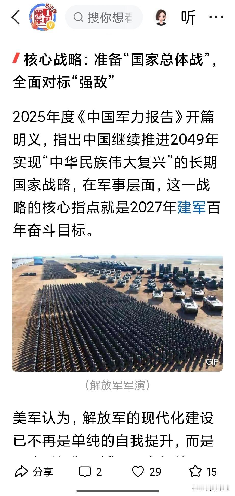 看来老美的智库还是有冷静的参谋班底的,都在预测2027一 年-2030年之间的节点,这个时间段是中美之间军事对抗风险可能的爆发点,随着解放军远洋与反介入实力的显著提升,不久的将来解放军将在西太平洋获得足够的话语权,那时的台湾海峡,一定会瓜熟蒂落。正所谓不战而屈人之兵,上兵伐谋。东大的国防愿景从来不是针对小规模局部冲突,通过提升军民融合,整合国内一切资源应对复杂多变的国际局势,具备打赢大规模国战的实力。