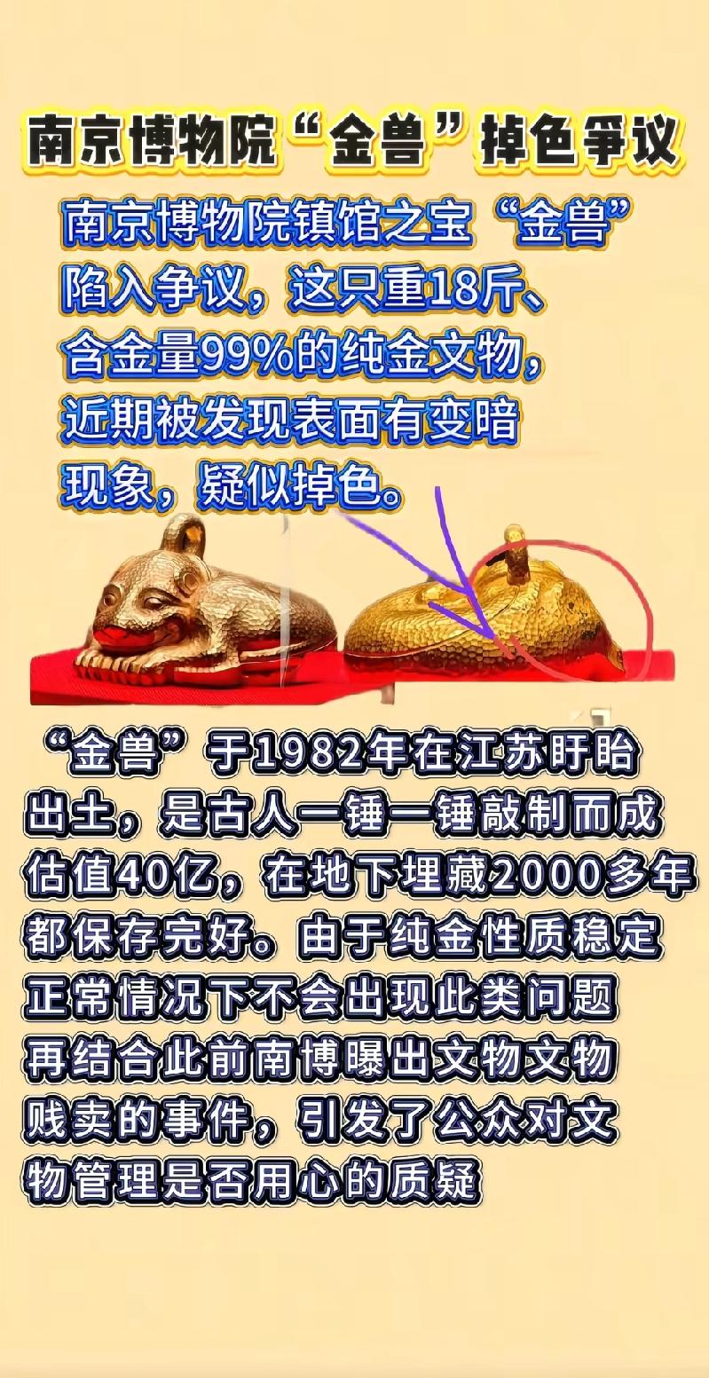 南京博物院的镇馆之宝,西汉纯金金兽,居然曝出掉色的事儿,真是滑天下之大稽! 那个西汉纯金金兽,平日里可是摆在馆里最显眼位置的镇院之宝。最近也不知道怎么传开的,说它居然掉色了。这下可好,不少人心里犯嘀咕,徐湖平老估计也头疼得够呛! 这传闻一出来,网上直接炸开了锅。有人翻出几年前拍的金兽照片,和现在的图片一对比,惊呼差别太大了——以前是沉甸甸的熟黄色,现在部分区域泛着灰白,斑纹沟壑里还透着暗沉,看着就不对劲。 更让人议论纷纷的是,有游客说自己带着干净棉签试了试,居然真的沾到了淡色痕迹。这一下,各种猜测全冒出来了,“纯金怎么会掉色?”“是不是被调包了?”的声音越来越大。 要知道这金兽的来历多不一般啊!1982年江苏盱眙的村民万以全,新婚不久挖水渠时一锹挖出来的,当时跟着它一起出土的还有满满一壶金币,总重量超20千克,直接轰动全国。 当年北京和南京还为这批国宝抢过呢,北京钱币博物馆想要壶里的“郢爰”,南博拿着省政府公文连夜赶去,三次交涉才在公安荷枪实弹护送下把宝贝运回来。 徐湖平那时候还是南博办公室主任,全程参与了接收和保护,后来当了院长更是把这金兽当宝贝护着。现在曝出这事儿,网友自然把目光都对准了他。 有人扒出早年间就有40多名南博员工联名举报他,说他违规处置文物,儿子开的拍卖公司还专做古代金银器,和馆藏高度重合,只是当年这事没了下文。 现在金兽又出了“掉色”传闻,大家难免多想——埋在地下两千年都没变色,怎么在博物馆里展出几十年就出问题了?当初说的恒温恒湿保护,难道是摆设? 还有人翻出金兽的基本信息,含金量99%、重9100克,是全国出土最重的古代金器,内壁还刻着“黄六”二字。这么珍贵的国宝,保护措施肯定是顶级的,怎么会出现“掉色”这种低级问题? 网友们越扒越起劲,有人说会不会是外展的时候被换了,毕竟不少国宝都有出国展览的经历,之前也有文物外展受损的情况;还有人猜测是保护过程中出了疏漏,接触到了化学物质。 各种说法传得有鼻子有眼,看客们看得心惊肉跳。毕竟这不是普通文物,是承载着西汉冶金技术和财富密码的国宝,要是真出了什么问题,可不是小事。 徐湖平这边还没给出让人信服的说法,网上的讨论已经愈演愈烈。大家心里都憋着疑问:这“掉色”到底是怎么回事?背后是不是真有不为人知的隐情? 各位读者你们怎么看?欢迎在评论区讨论。