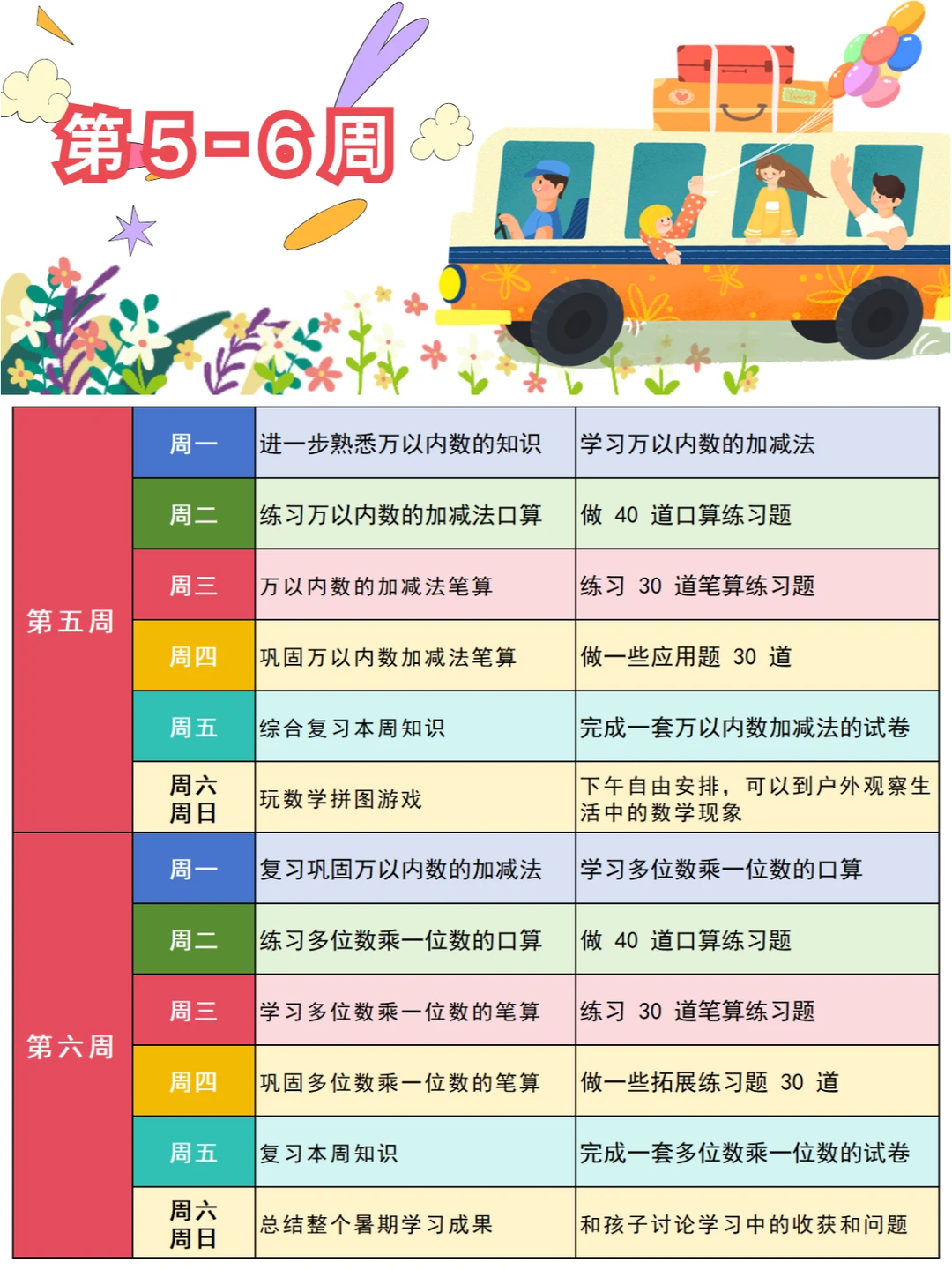 🚩学习计划分六周执行,每周一至周五进行知识复习和学习,周六周日进行总结实践,通过游戏和应用,加深孩子对知识的理解。