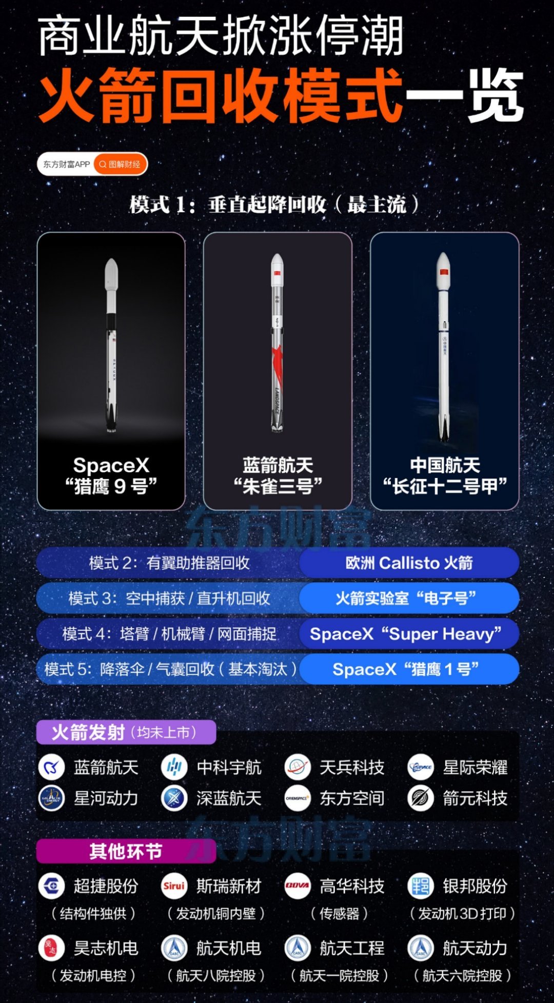 商业航天板块12月24日掀起涨停潮,超捷股份、新雷能、火炬电子、上海港湾、中国卫星、航天动力、九丰能源、国机精工等近20股涨停。综合市场观点来看,商业航天板块再次爆发,与我国又有可回收火箭发射升空密切相关。12月23日10时0分,我国在东风商业航天创新试验区实施长征十二号甲遥一运载火箭发射任务,火箭二级进入预定轨道,一级未能成功回收,飞行试验任务获得基本成功。此前的12月3日,蓝箭航天旗下朱雀三号重复使用运载火箭发射入轨,是国内首次尝试一级回收的运载火箭。公开资料显示,蓝箭航天成立于2015年,是国内头部民营航天企业之一。目前该公司的科创板IPO辅导工作已正式完成,有望成为科创板“商业航天第一股”。东吴证券近日研报指出,天龙三号(天兵科技)、引力二号(东方空间)、双曲线三号(星际荣耀)、智神星一号(星河动力)等一批新型可回收商业火箭有望陆续迎来首发。经过批量首飞验证,2026年商业火箭有望由量变引发质变,有望见证中国进入火箭可回收时代。而火箭回收技术,公开资料梳理来看,主要包括垂直起降(目前的主流模式)、有翼助推器回收、空中捕获/直升机回收、塔臂/机械臂/网面捕捉等模式。公开资料显示,目前我国除了“国家队”外,也涌现了一批民营航天企业,比如前述的蓝箭航天、天兵科技、东方空间、星际荣耀、星河动力,还有箭元科技、深蓝航天、中科宇航等等。除了这些火箭发射运营公司外,有券商研报表示,火箭侧还可关注超捷股份(结构件独供)、斯瑞新材(发动机铜内壁)、高华科技(传感器)、银邦股份(控股公司飞而康为发动机3D打印供应商)、昊志机电(发动机电控)等等。根据《2025年卫星产业状况报告》,2024年全球卫星产业总收入为2930亿美元,其中卫星制造业收入为201亿美元,发射服务业收入为93亿美元,而发射服务的收入多为卫星制造或卫星运营公司支付。华泰证券表示,若将卫星制造到发射入轨作为卫星公司的硬性成本,可推算出发射成本占卫星公司成本的30%。由此,华泰证券表示,可回收火箭的降本效应将直接惠及卫星公司,发射服务降价首先会降低卫星入轨门槛及卫星运营的商业成本,同时能够优化卫星公司的现金流情况,节约下来的经费或将有助于卫星产能的提升,也有利于商业航天产业的快速发展。