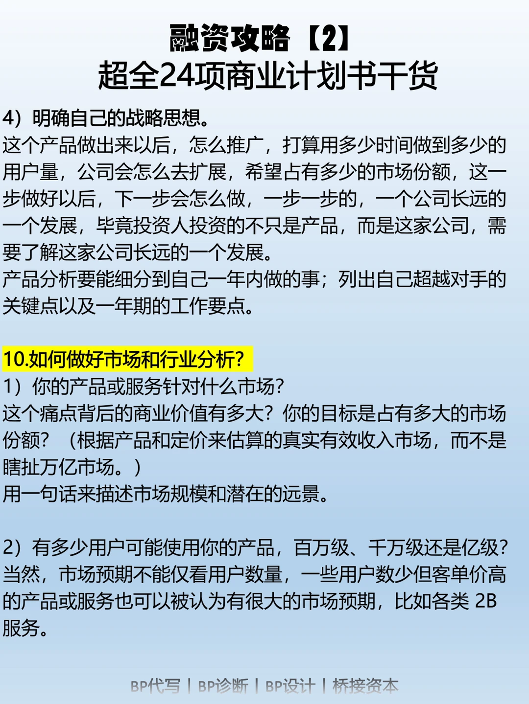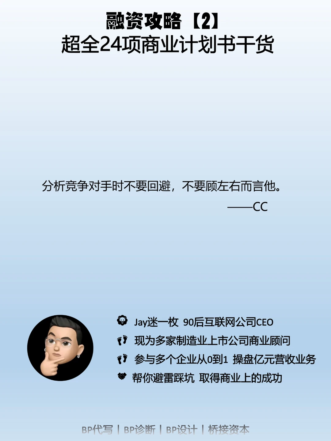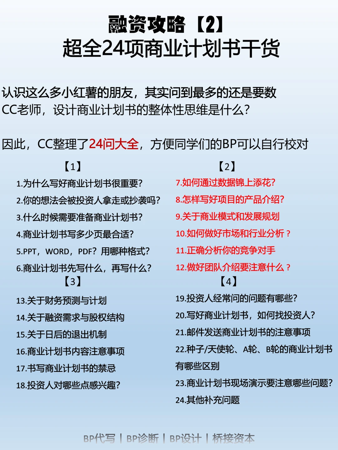 认识这么多小红薯的朋友,其实问到最多的还是要数 CC老师,设计商业计划书的整体性思维是什么? 因此,CC整理了24问大全,方便同学们的BP可以自行校对 【1】 1.为什么写好商业计划书很重要? 2.你的想法会被投资人拿走或抄袭吗? 3.什么时候需要准备商业计划书? 4.商业计划书写多少页最合适? 5.PPT,WORD,PDF?用哪种格式? 6.商业计划书先写什么,再写什么? 【2】 7.如何通过数据锦上添花? 8.怎样写好项目的产品介绍? 9.关于商业模式和发展规划 10.如何做好市场和行业分析 ? 11.正确分析你的竞争对手 12.做好团队介绍要注意什么 ? 【3】 13.关于财务预测与计划 14.关于融资需求与股权结构 15.关于日后的退出机制 16.商业计划书内容注意事项 17.书写商业计划书的禁忌 18.投资人对哪些点感兴趣? 【4】 19.投资人经常问的问题有哪些? 20.写好商业计划书,如何找投资人? 21.邮件发送商业计划书的注意事项 22.种子/天使轮、A轮、B轮的商业计划书有哪些区别 23.商业计划书现场演示要注意哪些问题? 24.其他补充问题