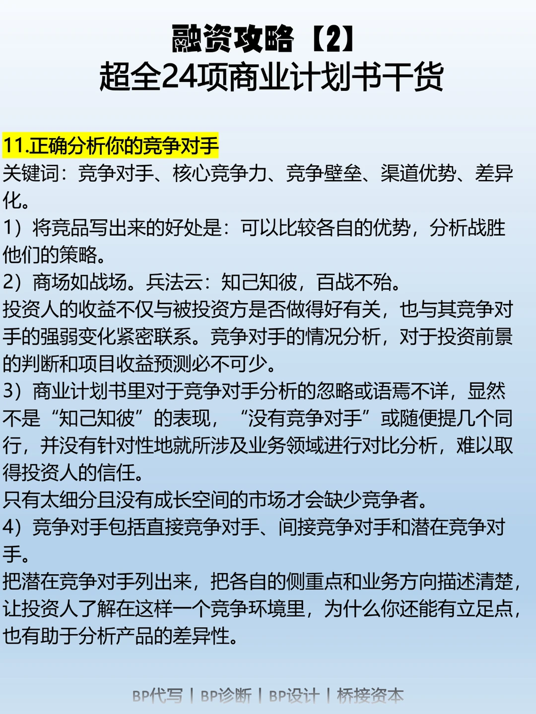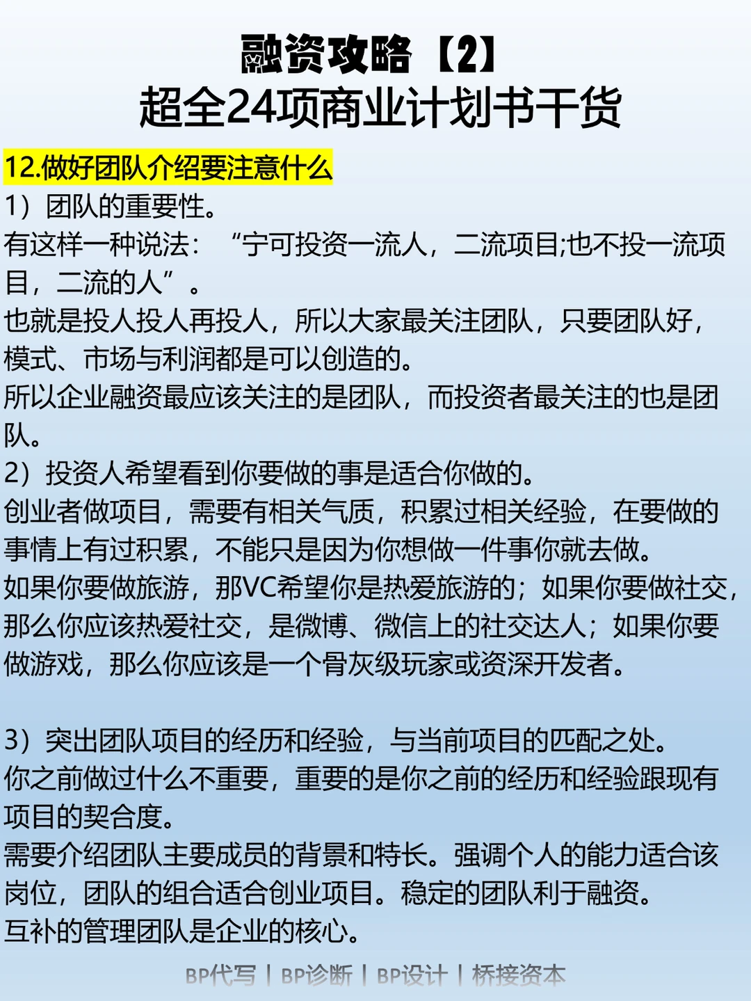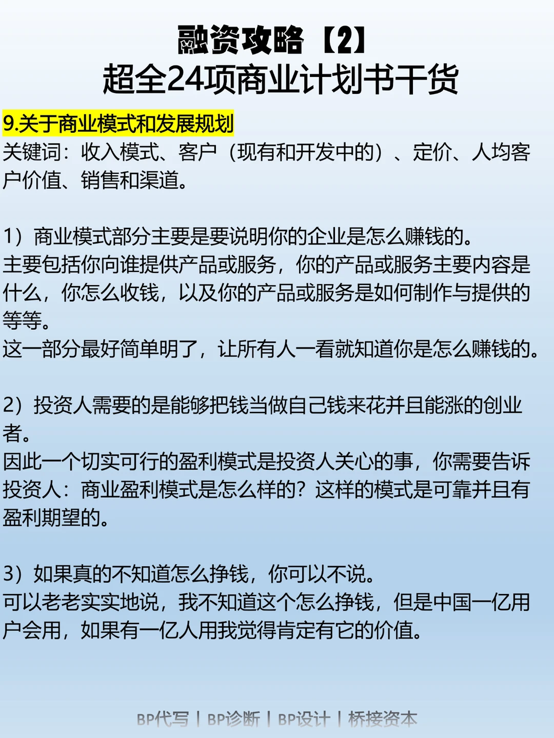 认识这么多小红薯的朋友,其实问到最多的还是要数 CC老师,设计商业计划书的整体性思维是什么? 因此,CC整理了24问大全,方便同学们的BP可以自行校对 【1】 1.为什么写好商业计划书很重要? 2.你的想法会被投资人拿走或抄袭吗? 3.什么时候需要准备商业计划书? 4.商业计划书写多少页最合适? 5.PPT,WORD,PDF?用哪种格式? 6.商业计划书先写什么,再写什么? 【2】 7.如何通过数据锦上添花? 8.怎样写好项目的产品介绍? 9.关于商业模式和发展规划 10.如何做好市场和行业分析 ? 11.正确分析你的竞争对手 12.做好团队介绍要注意什么 ? 【3】 13.关于财务预测与计划 14.关于融资需求与股权结构 15.关于日后的退出机制 16.商业计划书内容注意事项 17.书写商业计划书的禁忌 18.投资人对哪些点感兴趣? 【4】 19.投资人经常问的问题有哪些? 20.写好商业计划书,如何找投资人? 21.邮件发送商业计划书的注意事项 22.种子/天使轮、A轮、B轮的商业计划书有哪些区别 23.商业计划书现场演示要注意哪些问题? 24.其他补充问题
