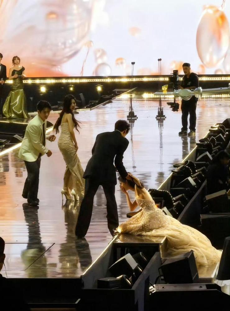 品牌方现在睡不着了。他们花20万借出的高定裙,被孟子义一跪跪出了破亿流量。 当时孟子义在湿滑的红毯台阶上那结实的一摔,看得人心都紧了,这力度绝对不是演出来的。 我更在意的是那几位同行的生理性反应,李昀锐真的是手比脑子快,在裙摆刚铺开的时候就冲上去托住了她。 还有丞磊和白鹿,三个人几乎瞬间形成了一种不需要排练的默契,稳稳架起了一座“人形扶手”,这画面比红毯定型照要有温度得多。 有人说这会不会是剧本?但我感觉要不是李昀锐拽得及时,孟姐差点就磕到门牙了。这种突发的狼狈感反而破掉了红毯的紧绷,真实得可爱。 这一幕直接让我想起当年詹妮弗·劳伦斯在奥斯卡颁奖礼上的那一跤,同样是昂贵的高定,同样摔成了全网疯传的经典,甚至还为迪奥赢回了十几年的热度。 再看看台下丁禹兮张大的嘴和鞠婧祎捂心的动作,这些0.5秒内的本能反应,才凑成了真正的“内娱活人图鉴”。 虽然这件金色的裙子可能没有大表姐那件迪奥惊艳,但这波泼天的流量确实是让品牌方血赚不亏,估计他们现在是边心疼裙子边笑醒。 其实比起千篇一律的精修图,这种带点烟火气的意外瞬间,反而更能让大家记住品牌和艺人。