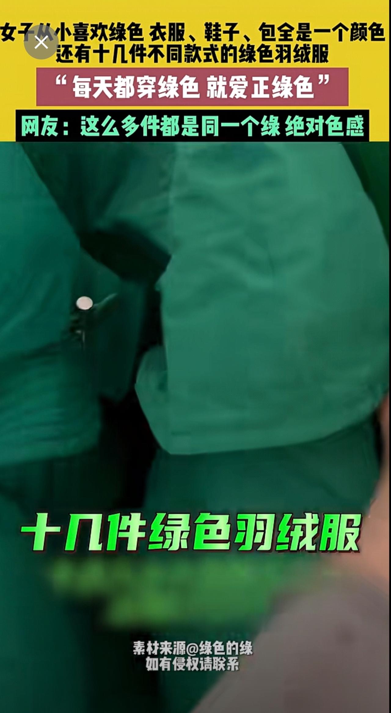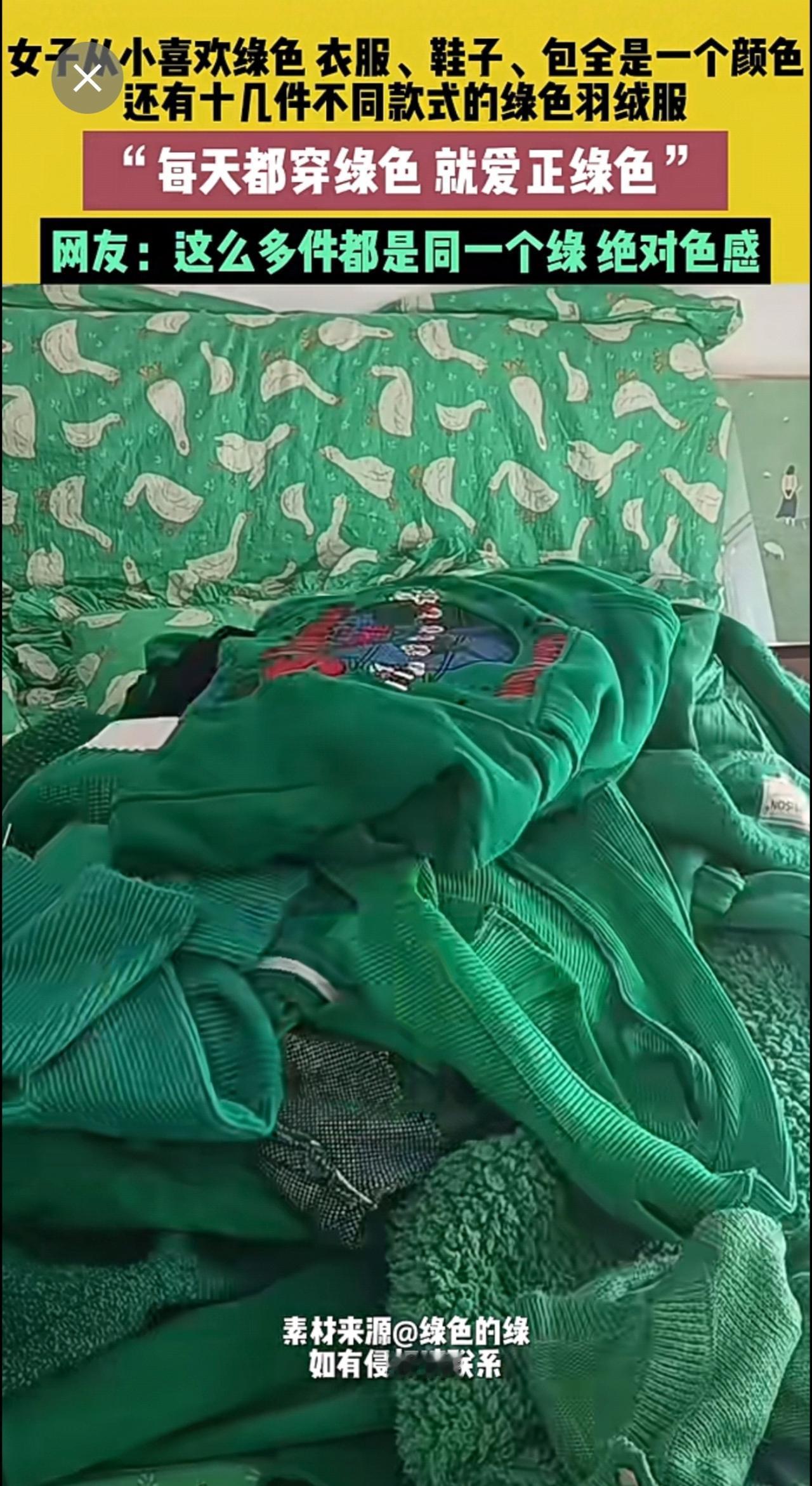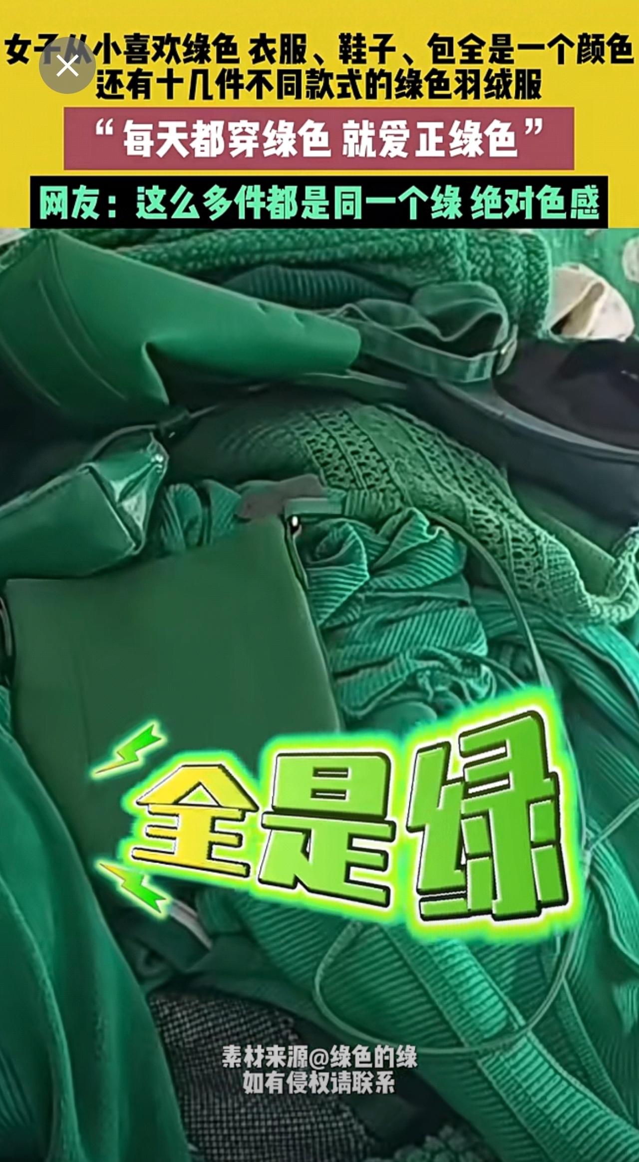 12月24日(发布),江苏,女子从小喜欢绿色 衣服、鞋子、包全是一个颜色,还有十几件不同款式的绿色羽绒服,“每天都穿绿色 就爱正绿色”,网友:这么多件都是同一个绿 绝对色感(编辑:心然)
