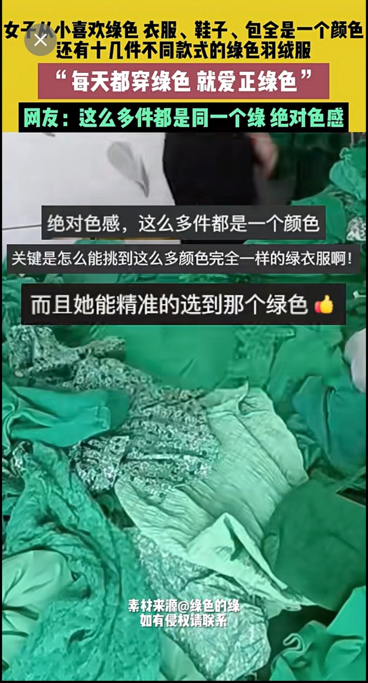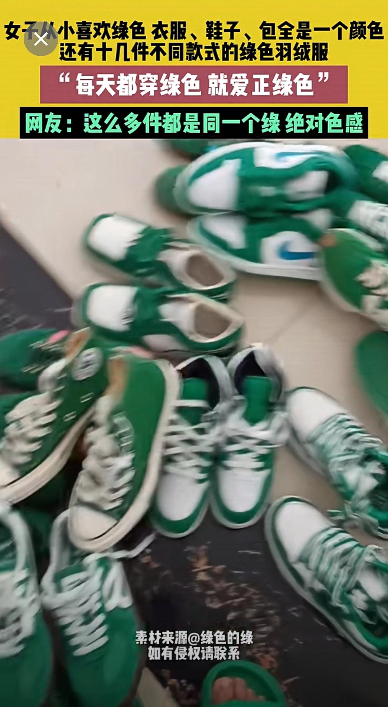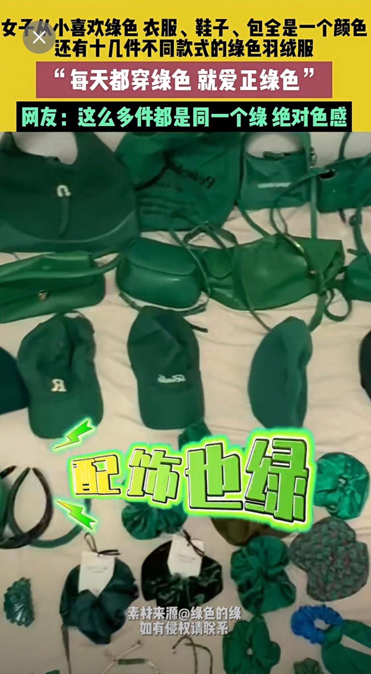 12月24日(发布),江苏,女子从小喜欢绿色 衣服、鞋子、包全是一个颜色,还有十几件不同款式的绿色羽绒服,“每天都穿绿色 就爱正绿色”,网友:这么多件都是同一个绿 绝对色感(编辑:心然)