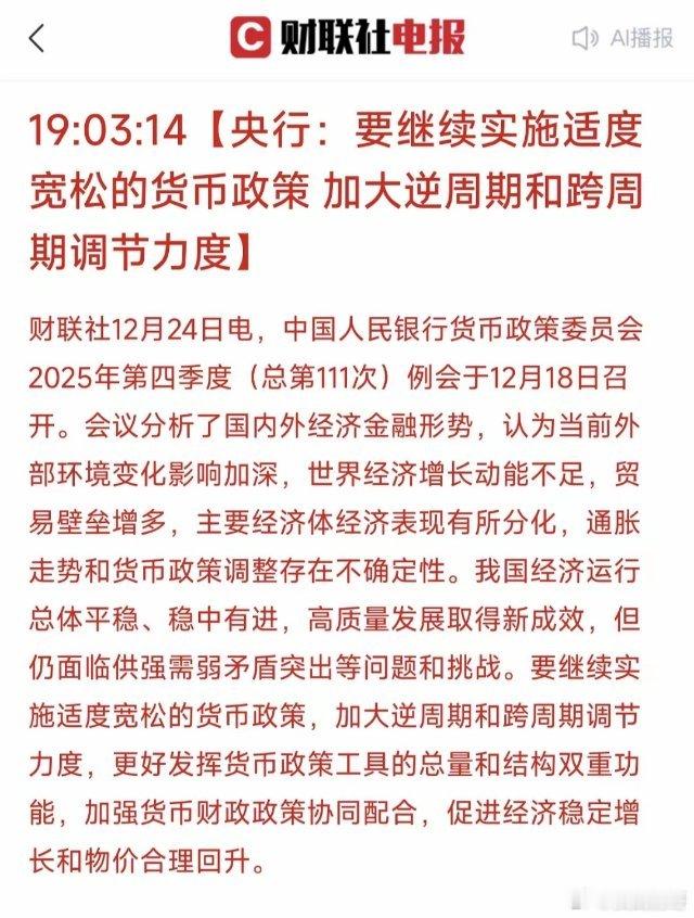大盘6连涨后,央妈释放重磅信号!再次强调要继续实施适度宽松的货币政策,加大逆周期和跨周期调节力度!可以说为明年定下了基调,宏观政策方面还是会偏宽松,具体到供需不平衡的问题上,会通过宽松的金融环境和政策协同,一起发力促进经济的健康发展,扩大内需,加强内循环!虽然并没有具体的措施,但是为明年的降准降息预留了空间,可以提升市场信心。配合明年美国继续降息,整个市场环境会得到根本性改善,相信到时候大盘会有不错的表现。