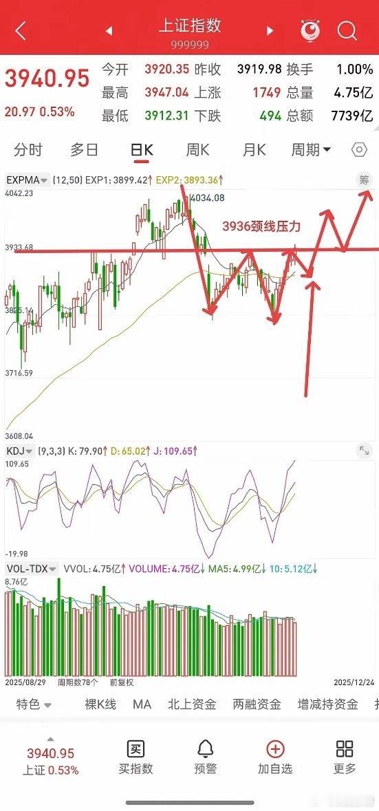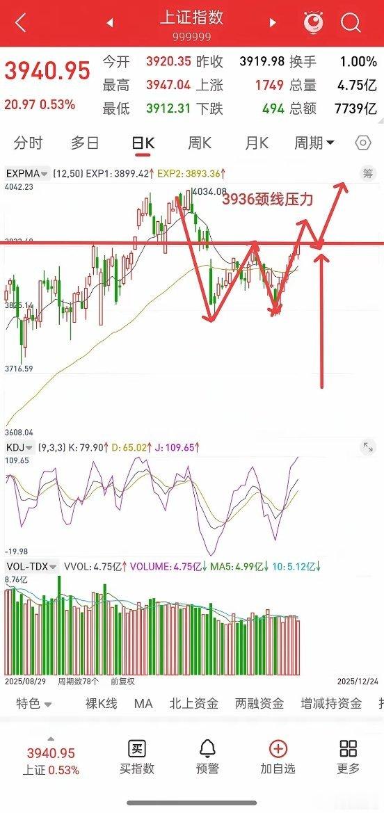 A股,从明天起,是新一波行情反转,还是诱多?先说观点,如果明天回踩不破3936颈线,且成交量不缩量,行情就可以看反转,且回踩3936附近,就是二次上车机会。后面反弹高度,看3985,甚至前高4034。如果明天跌破3936,或者缩量,以及收盘站不上3936,那基本上可以确定,反弹阶段结束,看新一波洗盘,洗盘位置看3900,也就是说3900附近,可以分批低吸。基本情况就这样!