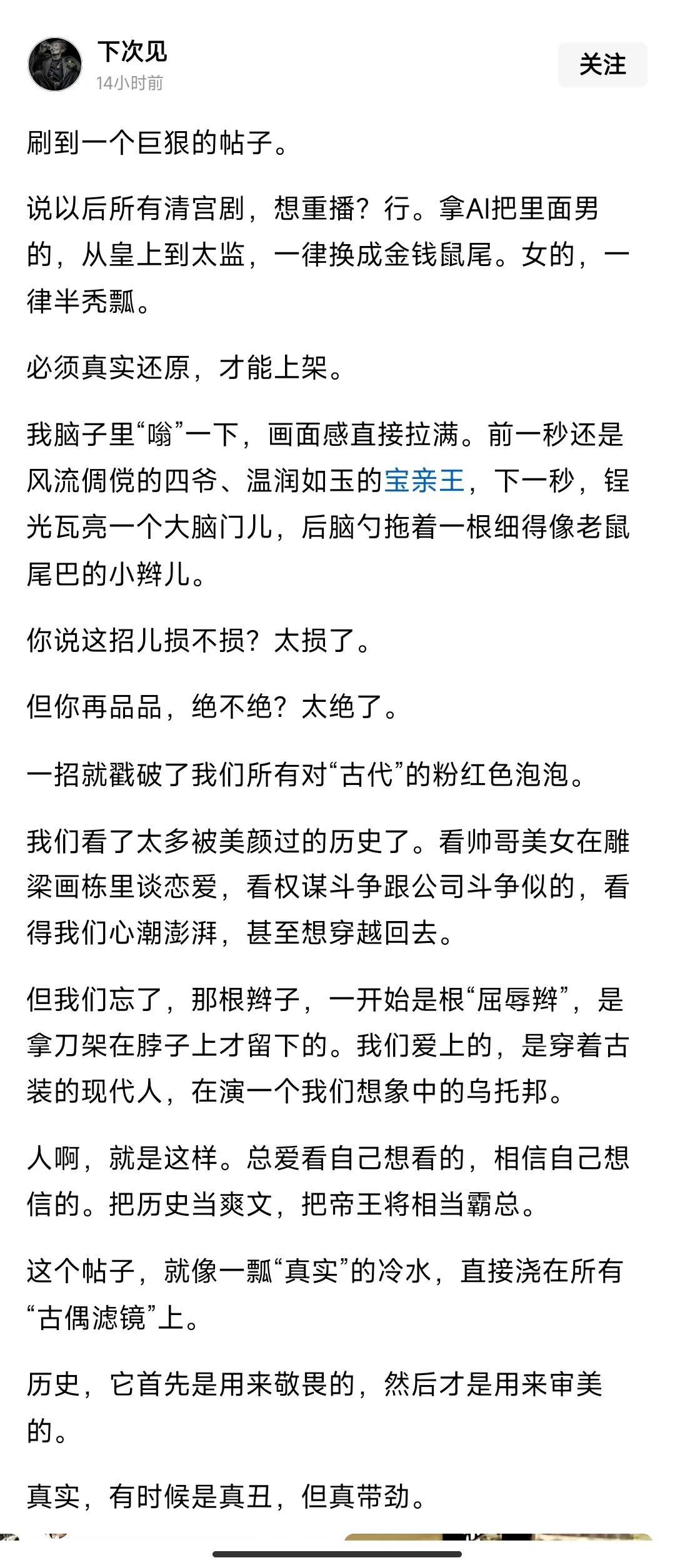 完全同意这位网友的观点,既然是重现历史,那就应该最大程度的还原历史,给历史以本来的真实面目! 现在看的那些清宫剧里面的人物形象与当时真正的人物形象差之甚远!虽然说艺术来源于生活,可以适当高于生活,但是高得过于离谱,高得完全不着边际,完全不着调,那就不是真正的艺术了! 所以这位网友提出的以后这类剧如果要通过审查,剧中人物的外在形象,必须与当时人们的外在形象大体相似或者相近,不能差得太远,否则的话一律不许公映! 至于当时人们的真正外在形象是什么样的,大家可以参考下面的这些图片,做到心中有数,以后再看到那些人物形象差得离谱的影视剧,直接换频道,或者直接走人。