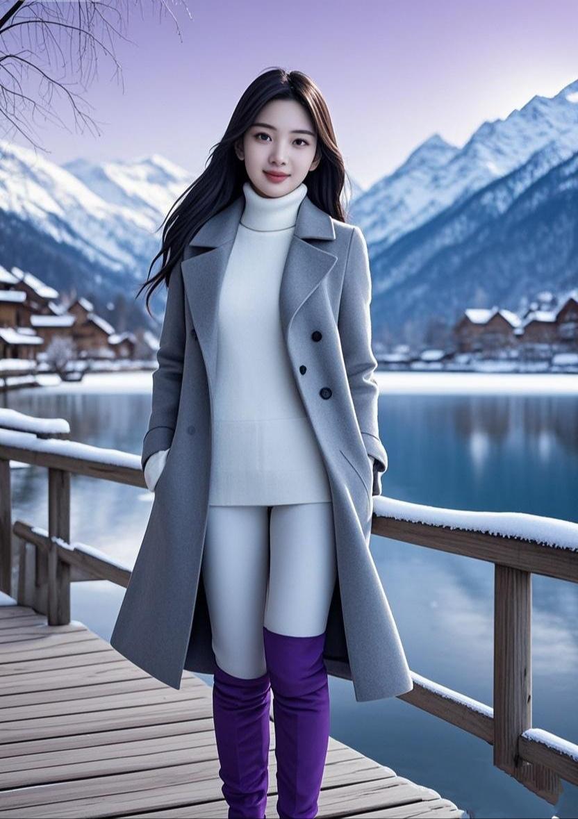 《雪境紫衣》 雪山衔着淡紫的云,木桥凝着霜 灰呢大衣裹住冬的凉,白衫衬着眸光 紫靴踩碎木板上的雪,涟漪在湖面轻漾 远山叠着银浪,人间此刻是素白的诗行 风掠过发梢,卷走俗世的慌 紫衣是寒天里,一抹不肯褪色的张扬 雪落无声,却漫过了木屋的窗 她站在画中央,把冬的清冷,揉成温柔的光   赏析:这首诗紧扣图片中雪山、木桥、灰大衣、白高领、紫长靴的核心视觉元素,以“雪境”为背景基调,用“淡紫的云”“银浪”呼应画面的冷色调,又以“紫衣”这一抹亮色作为诗眼,形成冷暖对比。诗句里“踩碎木板上的雪”“揉成温柔的光”等动态描写,让静态的画面有了流动的质感,既勾勒出雪景的清冽,又刻画出人物在寒天里兼具清冷与鲜活的气质。紫裙舞雪 紫衣雪地 紫裙雪地 紫裙幻雪境 墨衣冬景 雪境紫衣影 雪地紫纱
