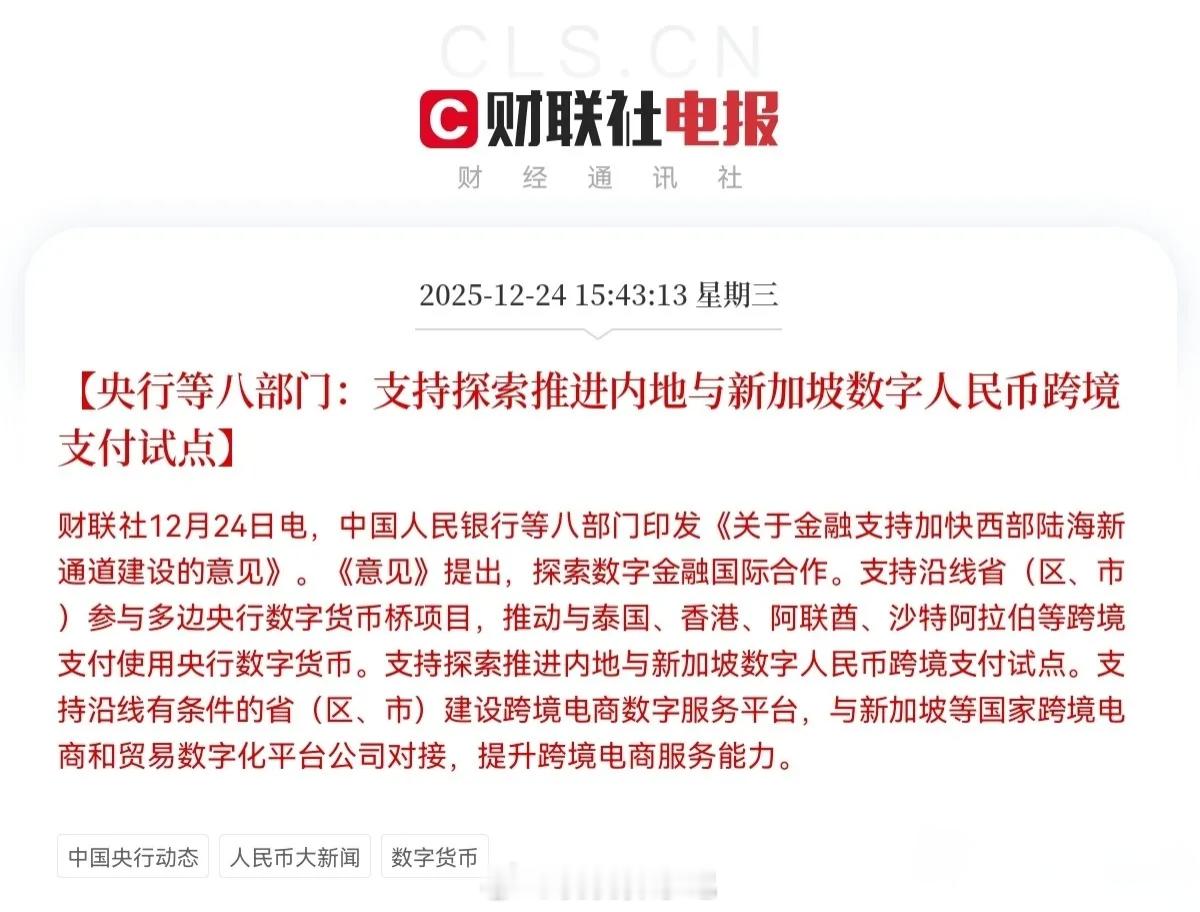 盘后重磅利好突袭!八部门联合发文,数字货币迎史诗级政策催化,明日这条主线大概率全线起爆!今日收盘后15:43,央行牵头八部门联合发布《关于金融支持加快西部陆海新通道建设的意见》,释放数字货币超级重磅利好!文件明确提出,支持内地与新加坡开展数字人民币跨境支付试点,同步推动数字人民币在与泰国、香港、阿联酋、沙特阿拉伯等地区的跨境支付落地,同时鼓励沿线省市参与多边央行数字货币桥梁项目。此次政策利好含金量十足,绝非普通利好:一方面直接突破数字货币跨境支付核心瓶颈,打通人民币国际化关键通道;另一方面,借力跨境支付场景落地,大幅提升人民币在全球跨境金融基建中的话语权,更是数字人民币从国内试点走向国际化落地的重要里程碑,行业迎来实质性大利好加持!利好落地之下,市场共识高度一致,数字货币概念迎来确定性风口,资金抢筹预期拉满,明日板块大概率高开高走、全线走强,板块炒作情绪有望全面升温!✅ 数字货币核心受益龙头名单(十大核心标的):神州信息、长亮科技、宇信科技、新大陆、新国都、拉卡拉、广电运通、信安世纪、楚天龙、京北方