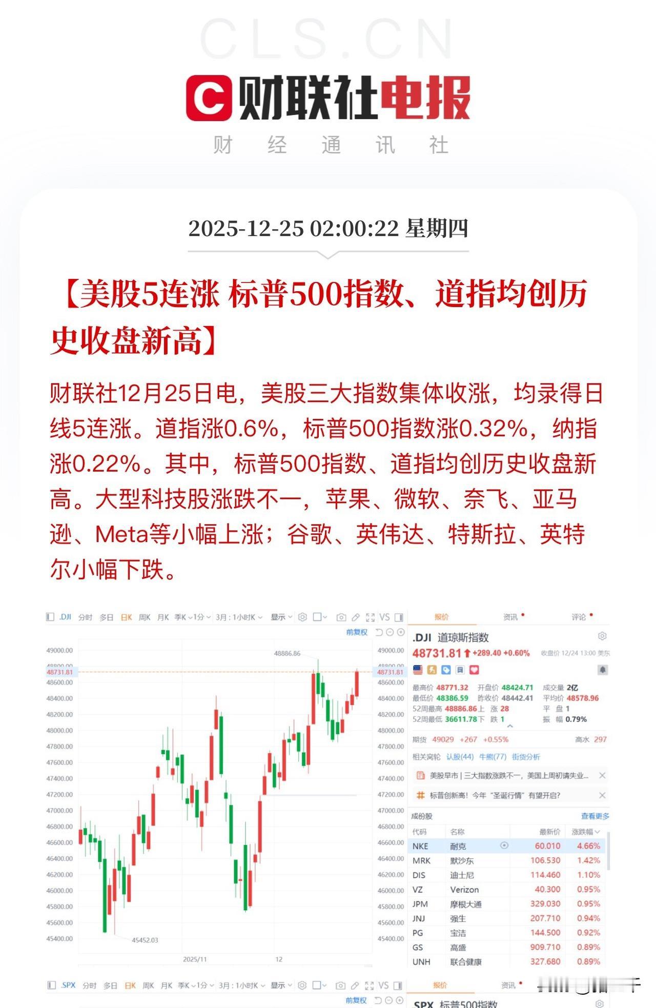 美股5连阳喜迎圣诞! 隔夜美股因为圣诞节假期原因只交易半天。 科技七姐妹涨跌互现, 存储芯片美光科技、闪迪领涨。 道琼斯方面消费医药旅游商超金融股普涨, 耐克、沃尔玛、迪士尼等烘托节日气氛, 圣诞树下吃火鸡的欢声笑语, 不得不感叹又是一年。 金银铜创新高后高位十字星要小心, 包括国内这边的碳酸锂期货主连, 要防止期货市场的黑色星期五, 因为多品种共振空单砸跌的诱惑太大了。 期市可能成功99次不抵失败一次, 要保住利润呀…
