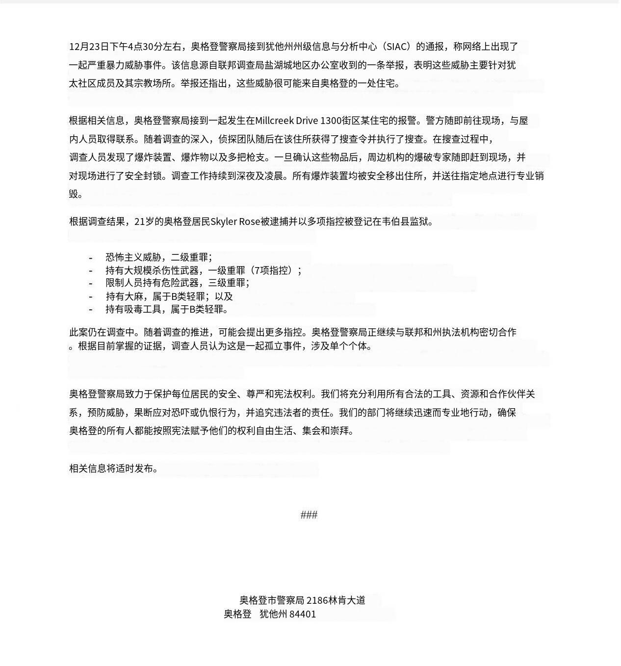 新闻快讯——美国犹他州奥格登市一名21岁男子斯凯勒·罗斯因涉嫌在网上发布针对犹太社区及犹太宗教场所的威胁言论被捕。警方表示,在对其住所进行搜查时,查获了爆炸装置、爆炸物原料以及多支枪支。 该男子面临多项重罪与轻罪指控,其中包括7项与大规模杀伤性武器、恐怖主义威胁、非法持有武器及涉毒相关的罪名。