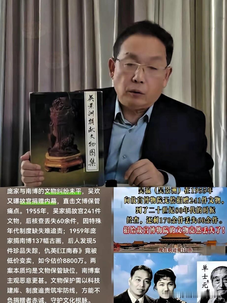 南博事件尚未平息,故宫博物院又出现丢失珍贵文物的问题。 吴瀛的孙子吴欢表示,吴瀛生前捐赠给故宫博物院的241件珍品,目前仅剩下170余件,60多件珍品不知去向。官方回复称因制度不健全,没有追索方案。 网友表示,这事关文化自信,国有博物馆能不能守住底线,关键在制度的落实、透明的管理和追责。真正的保护,不是口头上说说,而是有实质性的制度安排,而不是虚假的承诺。
