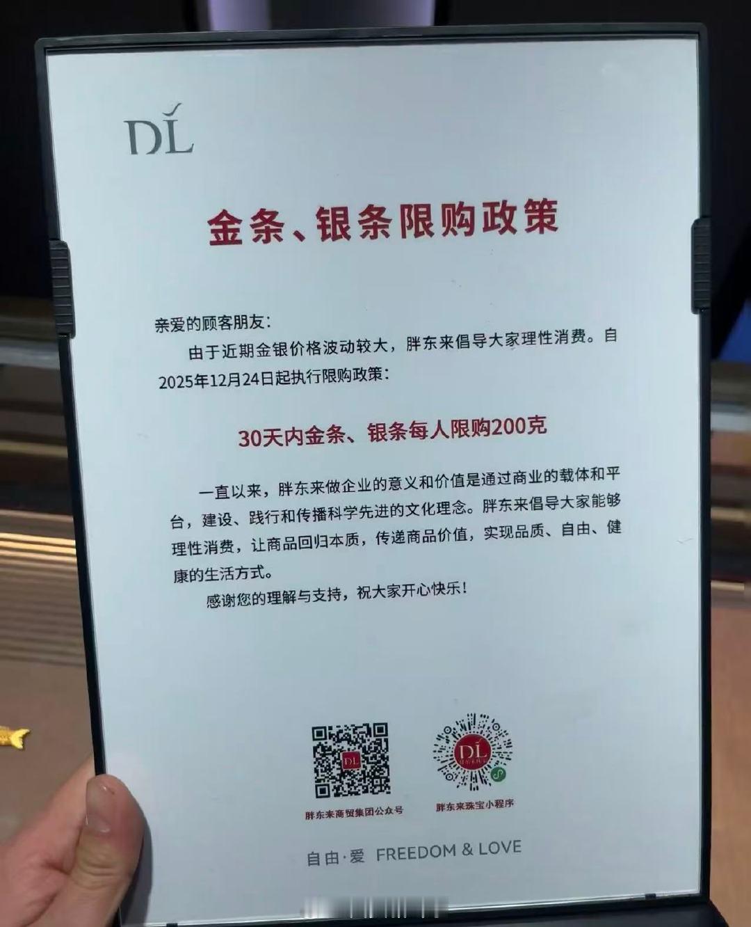 【胖东来金条银条限购】胖东来金条银条30天内每人限购200克12月24日,胖东来商贸集团发布限购政策:由于近期金银价格波动较大,胖东来倡导大家理性消费。自2025年12月24日起执行限购政策。30天内金条、银条每人限购200克。一直以来,胖东来做企业的意义和价值是通过商业的载体和平台,建设、践行和传播科学先进的文化理念。胖东来倡导大家能够理性消费,让商品回归本质,传递商品价值,实现品质、自由、健康的生活方式。感谢您的理解与支持,祝大家开心快乐!