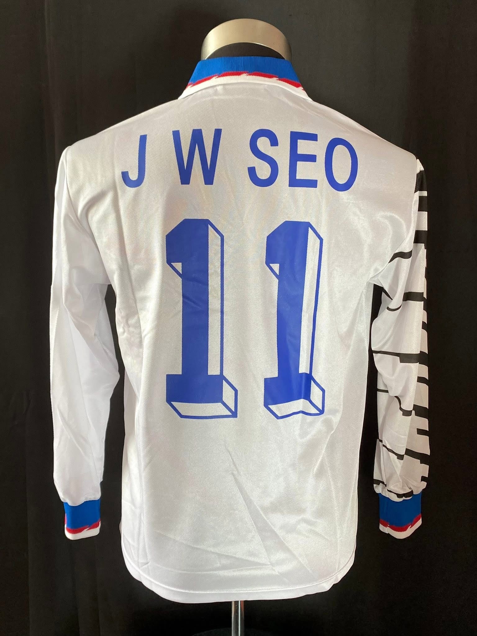 90年代南韓國家隊主力前鋒徐正源(Seo Jung-Won),與崔龍洙、黃善洪、高正雲& 洪明甫一樣同為當時該國嘅icon(足球旗幟性人物)。而呢套南韓本土品牌 Rapido生產嘅作客波衫,設計都好有特色。講番徐正源,過去五年佢都係喺國內任教成都蓉城,直至近日與球隊方針不一,宣佈離隊。不過都得到好多成都球迷去機場歡送,畢竟短短幾年帶領球隊升班,且成為中超前列分子,亦都成功打入亞冠精英賽。