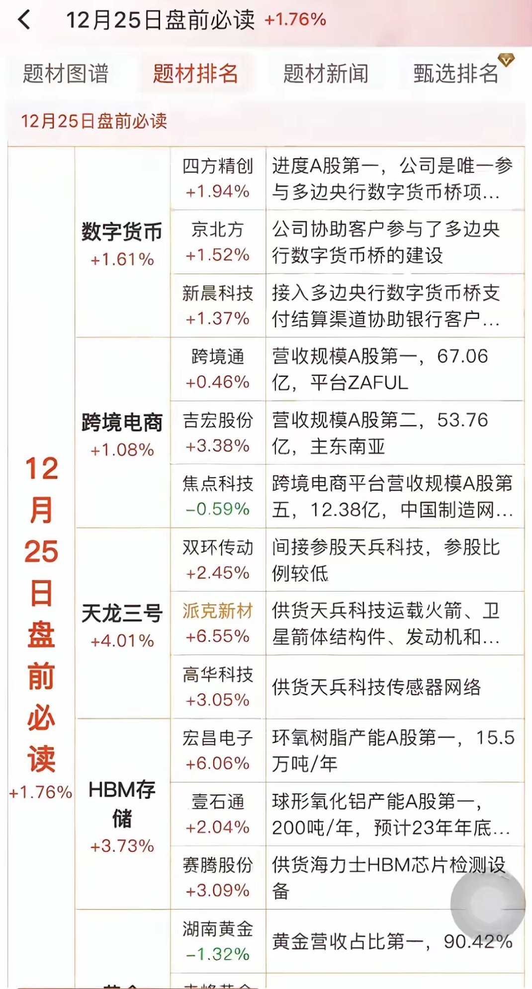12.25周四早参:五大主线抢先看,跨年行情锚定这些方向1. 数字货币+跨境支付:政策暖风频吹叠加跨境贸易需求激增,这条赛道的技术落地与场景渗透正在提速,有望成为跨年行情的隐形主线。2. 跨境电商:年末海外消费旺季来临,叠加物流与汇率双重利好,头部平台的订单数据持续超预期,板块修复行情值得期待。3. 可回收火箭“天龙三号”:商业航天赛道再迎重磅催化,天龙三号的研发进展牵动市场神经,技术突破有望带动产业链上下游共振走强。4. HBM存储涨价潮:供需缺口持续扩大,HBM价格涨势不止,核心供应商的业绩兑现能力正在凸显,资金关注度持续升温。5. 黄金+人民币升值:人民币汇率走强支撑贵金属估值,叠加全球地缘局势扰动,黄金板块的避险与配置价值同步提升。