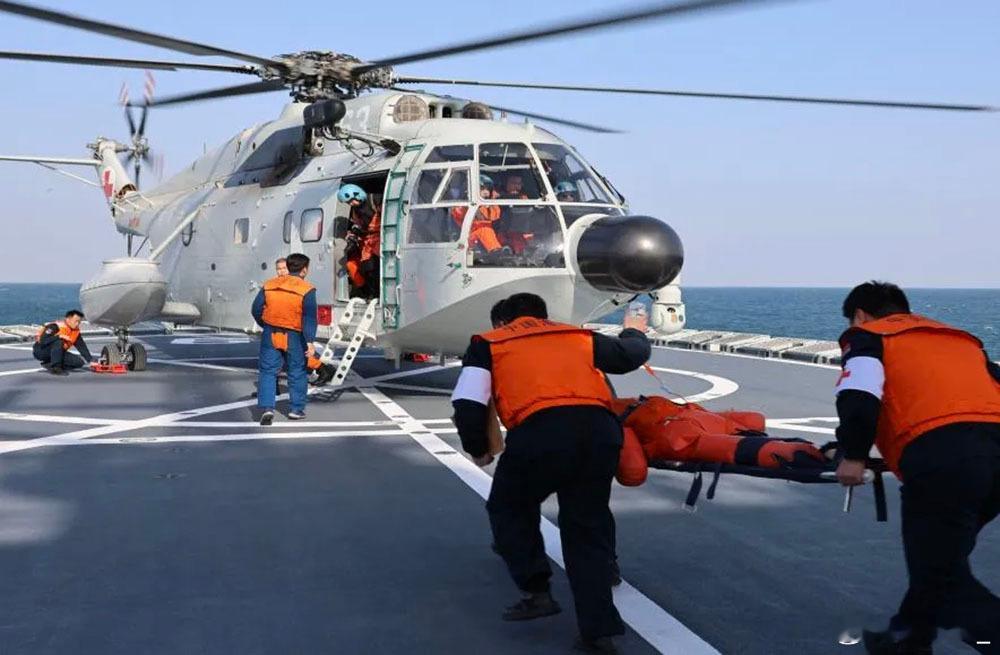 Z-8JH在北拖743船降落 :北拖743是1.4万千瓦远海救助拖船,此船为海军吨位最大、拖力最大的拖船,最大排水量达6千余吨。船首飞行甲板可以起降大型直升机。