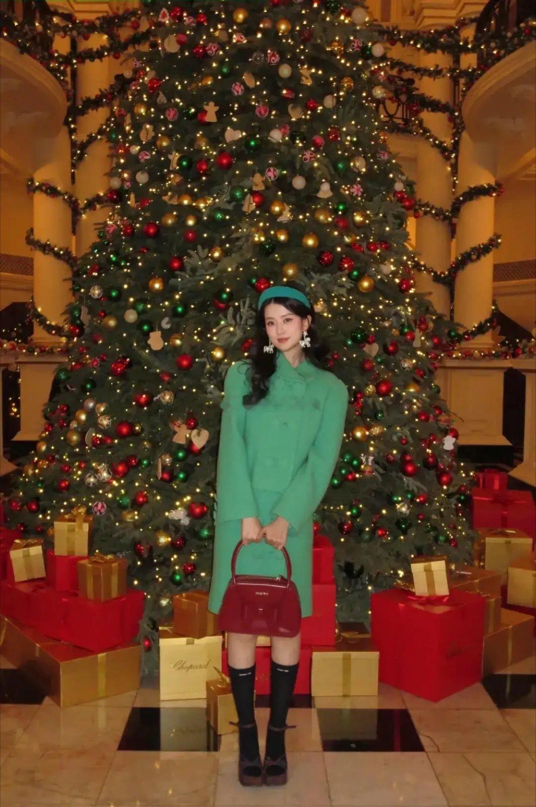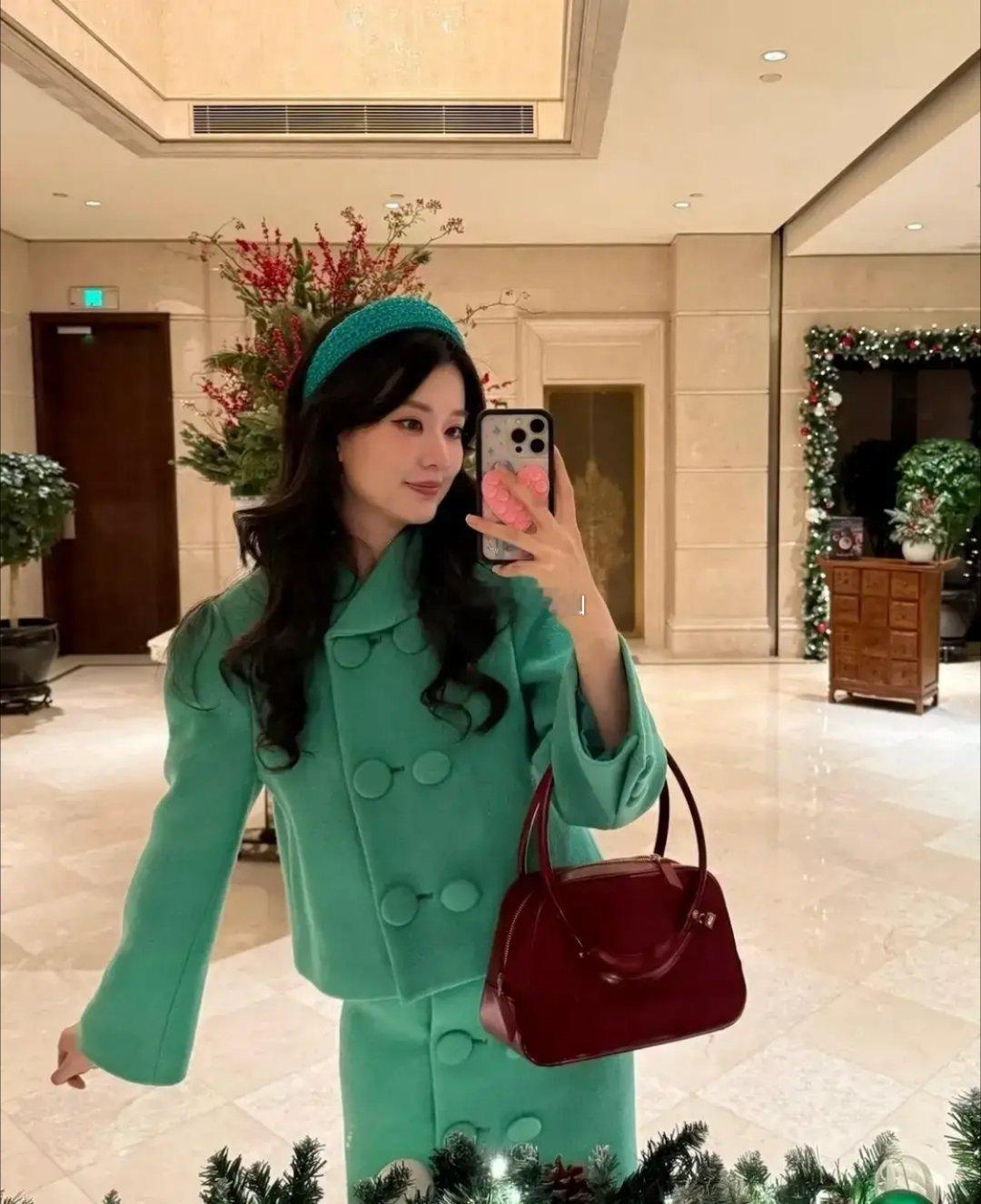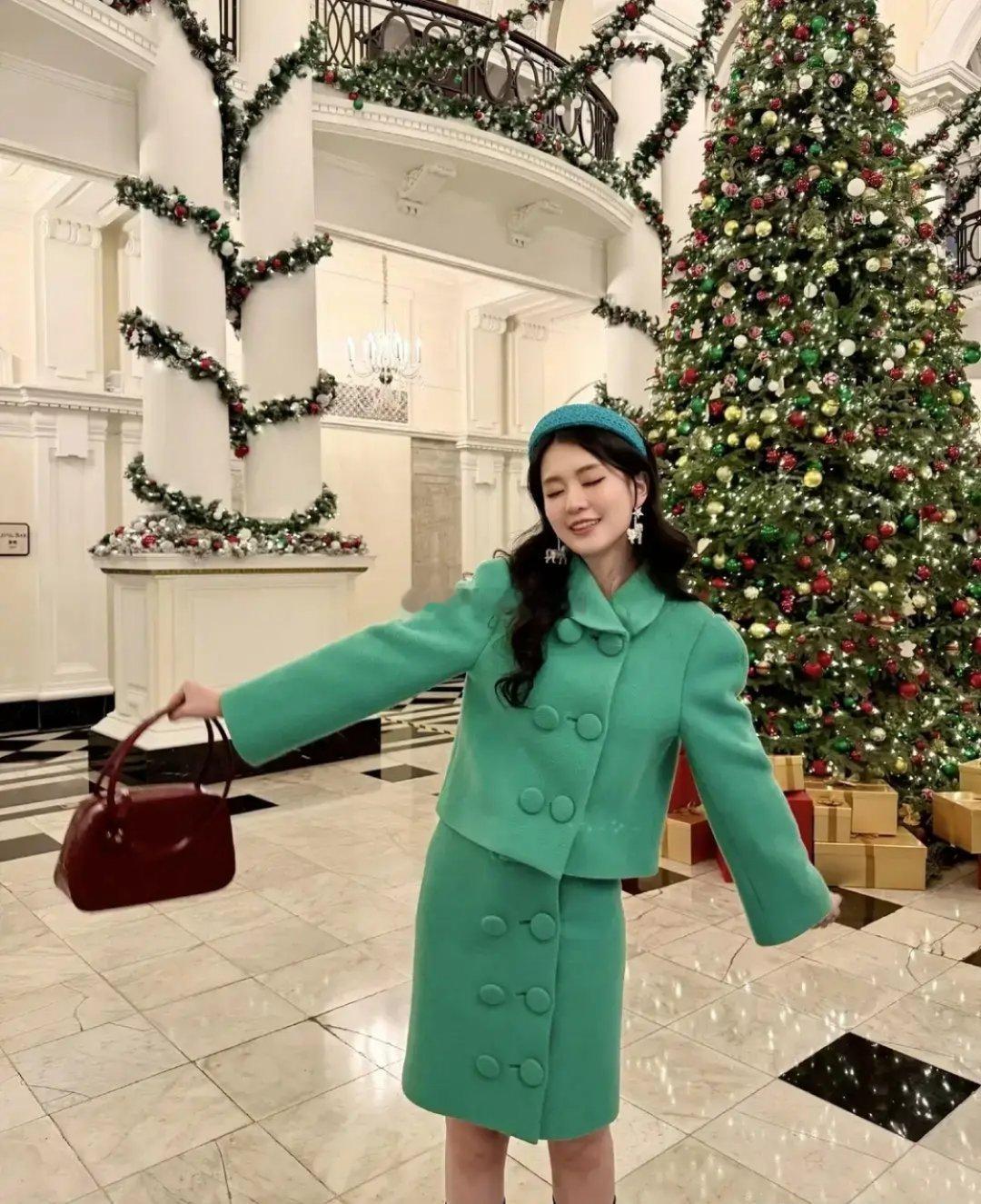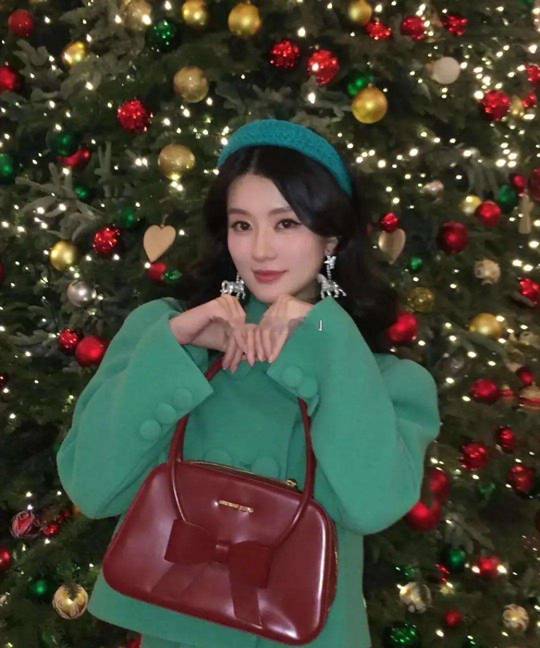 乔欣于平安夜晒出美照。她身着绿色毛呢套裙,搭配红色包包身材高挑气质出众,