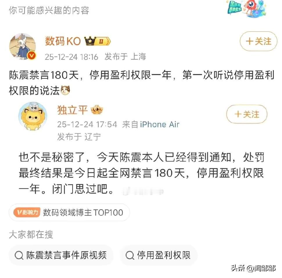 有博主爆料陈震最终的处罚结果出来了! 全网禁言 180天,停用盈利权益1年! 如果这是真的,那么这处罚已经相当宽容了!毕竟他已经涉及到偷税漏税了! 之前我还认为他 可能就此消失在网络上,被全网封禁,被永久禁言! 这个处罚结果,看来陈震一年后还是有望复出的! 网络通常没有记忆的,一年过后,绝大多数都不会记得以前的事了! 毕竟他可是千万粉丝级别的大V,他依然还有很大的商业价值,应该还会有人找他合作! 你们觉得呢? 陈震车评