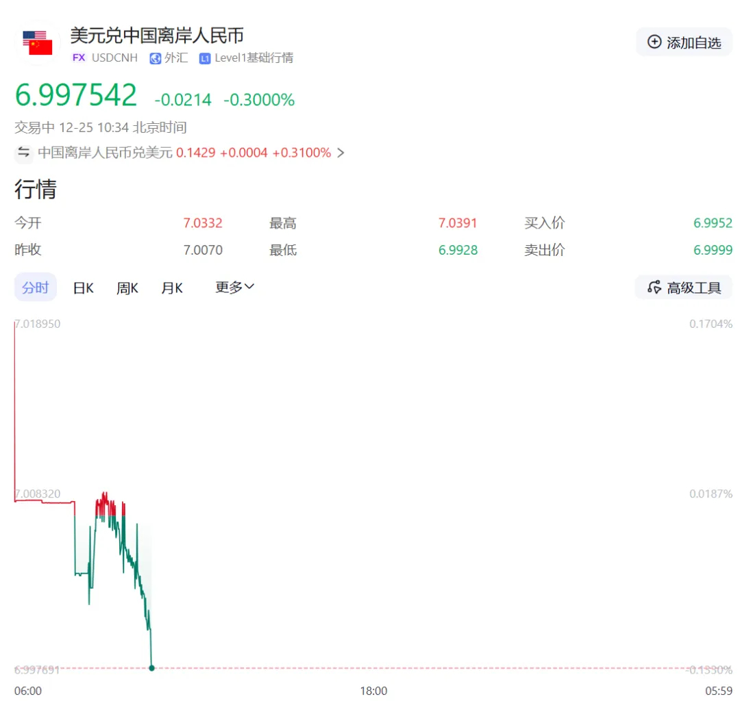 【破7!人民币大幅升值,杭州市民:#年初存8400美元现亏1033元人民币#】12月25日,离岸人民币兑美元汇率升破7.0大关。今年以来,人民币兑美元整体震荡上扬态势。2024年12月31日收盘,离岸人民币兑美元汇率为7.3368。人民币的大幅升值,也使得美元存款成了“负收益”。杭州市民张凯(化名)手头上有1万多美元外汇,今年2月份一部分美元(8400美元)办了13个月的定期存款,到期利率为2.8%,到期收益254.8美元。如果按目前的汇率计算,本金加利息相当于人民币60596元;而年初的时候,8400美元相当于61629元人民币。也就是说,按人民币计价的话,张凯的8400美元不但没赚到钱,反而亏1033元人民币。张凯的朋友李敏(化名)因为孩子在国外留学,前几年换了不少美元,其中一部分暂时购买了美国长期国债,一年的收益有将近5%。“有一笔5万美元左右的国债,大部分是在汇率7.2左右换的。”李敏说。按5%的利率计算,5万美元本金加利息一共是52500美元,按目前人民币计价的话相当于367573.5元;而当初的5万美元的换汇成本是360480元人民币。也就是说,在享受美国国债5%高收益的情况下,按人民币计价,这一年李敏5万美元的收益只有7093.5元人民币,收益率1.97%,仅略高于一年期人民币定期存款。“我的好几个同事、同学,今年买A股收益率普遍很不错,有20%、30%的,还有50%以上的,感觉我买了美国国债错过了一个亿。”李敏调侃自己说。不过,好消息是,对留学家庭来说,人民币兑美元升值降低了留学成本。郭瑛(化名)的孩子今年8月刚去美国读研,六七月份的时候换汇成本还要7.18到7.2。“马上要缴下学期的学费了,还有孩子的生活费也要提早准备。我刚才查了一下,现在换汇成本是7.0288,如果换10万美元,跟六七月份比可以节省人民币1.7万左右。”值得注意的是,自特朗普再次上台以来,美元指数大幅下跌,意味着美元对全球主要货币出现大幅贬值。