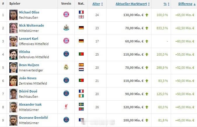 《转会市场》发布了2025年全球球员身价涨幅排名情况,效力于拜仁的奥利塞位列第一。1.奥利塞(拜仁慕尼黑)现身价1.3亿欧元,涨幅6500万欧元2.沃尔特马德(纽卡斯尔联)现身价7000万欧元,涨幅6250万欧元3.卡尔(拜仁慕尼黑)现身价6000万欧元,涨幅6000万欧元4.维蒂尼亚(巴黎圣日耳曼)现身价1.1亿欧元,涨幅5500万欧元5.赫伊森(皇家马德里)现身价7000万欧元,涨幅5200万欧元