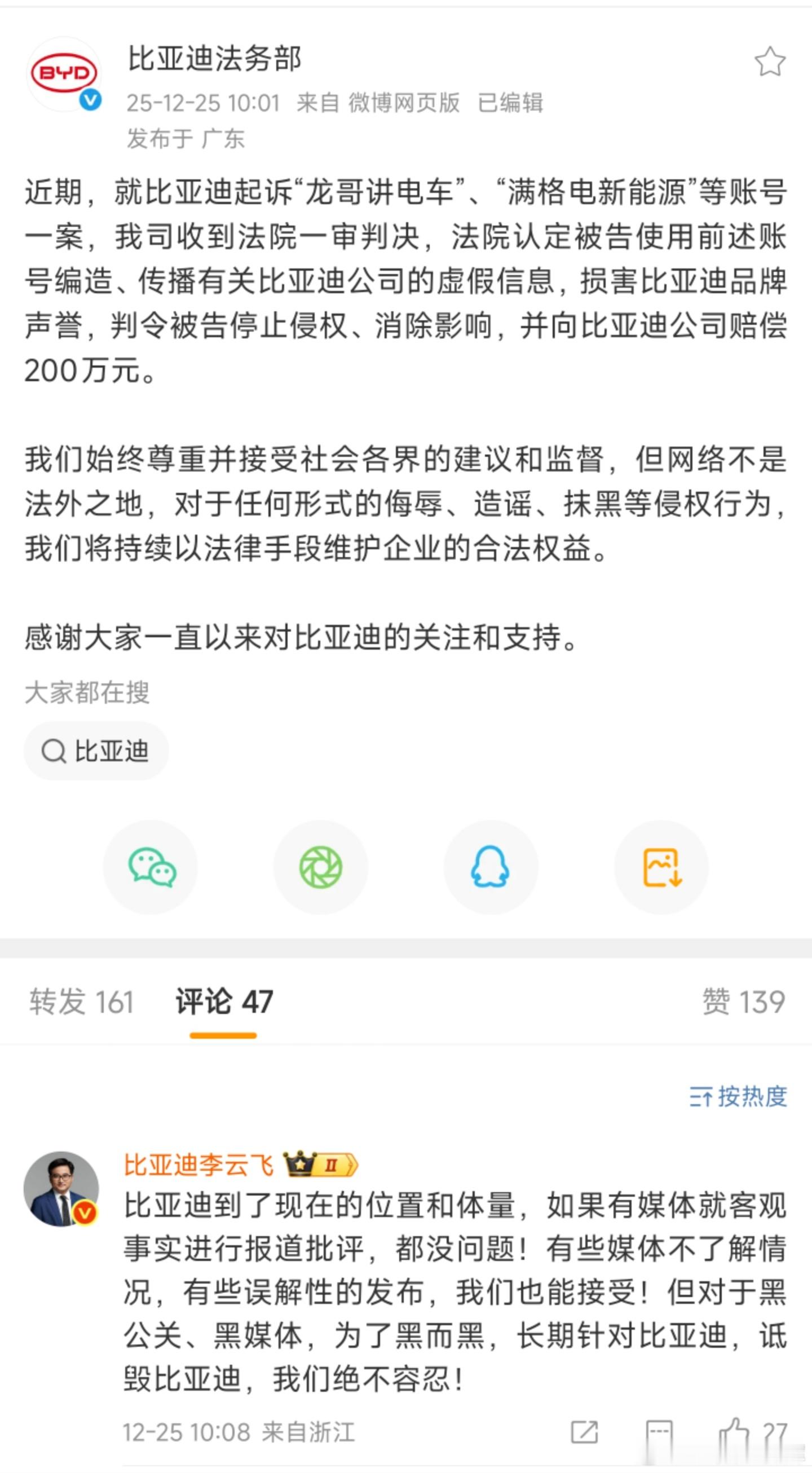比亚迪起诉“龙哥讲电车”、“满格电新能源”等账号一案,法院一审判决向比亚迪公司赔偿200万元,最近法务真的有干活,我相信不会有漏网之鱼,该走的流程都在路上话说赔偿200万,这种账号的自媒体有这个赔付能力吗?