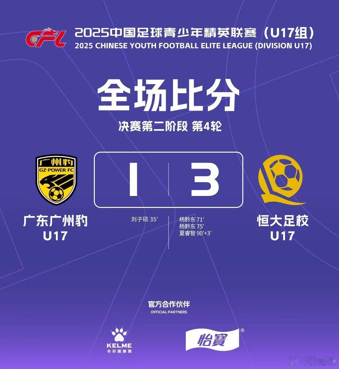在中青赛U17组第四轮中,广州豹U17迎战排名榜首的恒大足校U17队,上半场,广州豹U17凭借刘子硕的进球1:0领先,下半场,对手拼接杨黔东的梅开二度逆转比分,并由夏睿智将比分定格为1:3,最终广州豹U17 1:3不敌恒大足校U17。图片 此役过后四场比赛三平一负,进6球丢8球积三分位列第五。在失败中反思,在比赛中进步。将士从不言弃,希望小豹子继续打好接下来的三场比赛,在每场比赛都能有所收获。