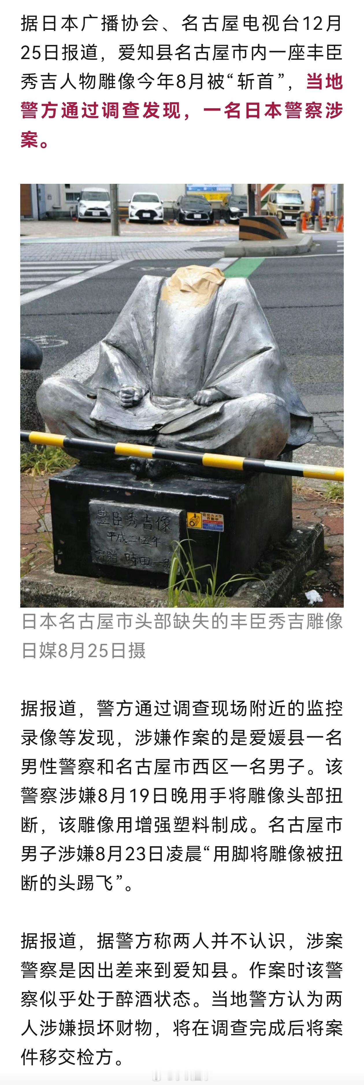 丰臣秀吉的雕像竟然是塑料做的,用脚将扭断的塑像头踢飞的两名男子中,竟然有日本爱媛县的一名警察。
