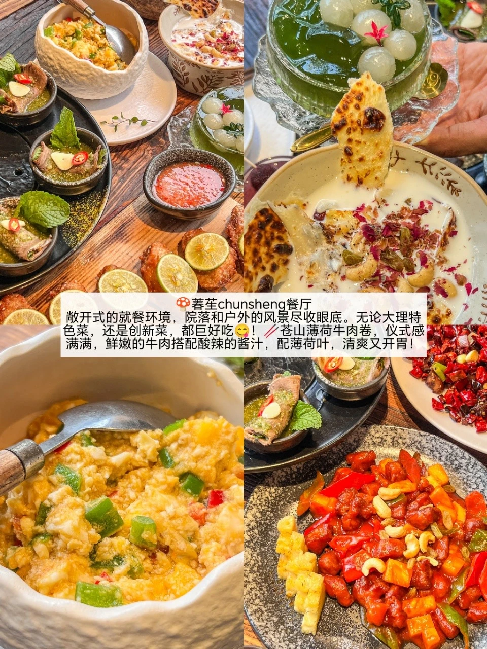 敞开式的就餐环境,院落和户外的风景尽收眼底。无论大理特色菜,还是创新菜,都巨好吃😋!🥢苍山薄荷牛肉卷,仪式感满满,鲜嫩的牛肉搭配酸辣的酱汁,配薄荷叶,清爽又开胃!