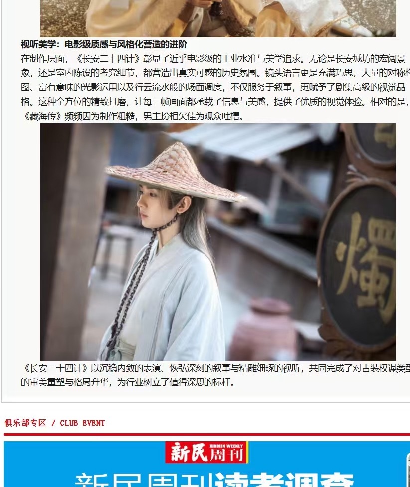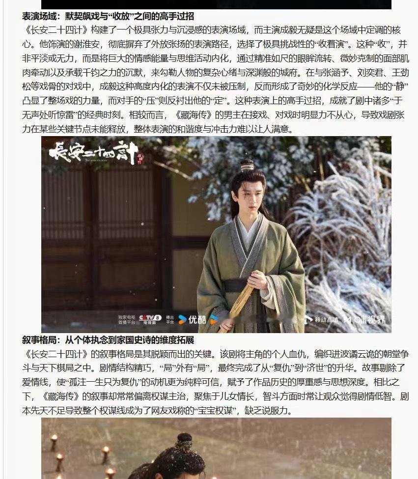 新民周刊:成毅长安二十四计古装剧作的审美进阶和格局之辩,无论在主演演技、故事格局、质感风格都是多维度的提升这不是粉丝说的哈,剧好不好大众自己看得到。同平台差不多类型的剧业内观众横向对比是正常的哈,观众是很聪明的