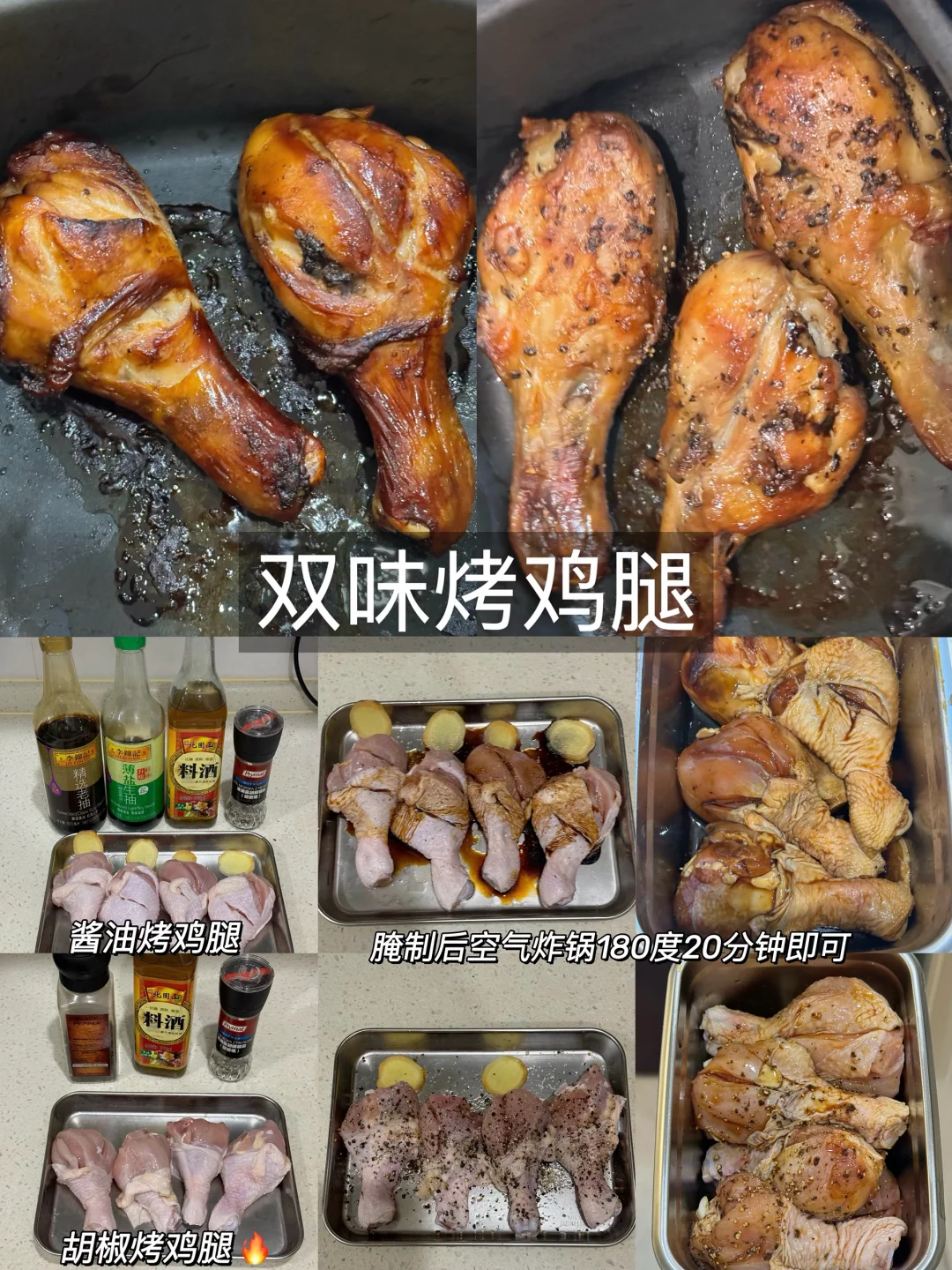 买一大包鸡腿不知道怎么处理的,安排两种口味的烤鸡腿,腌制一晚分装冷冻储存随时要吃拿出来空气炸锅180度20分钟即可皮脆肉嫩超级完美