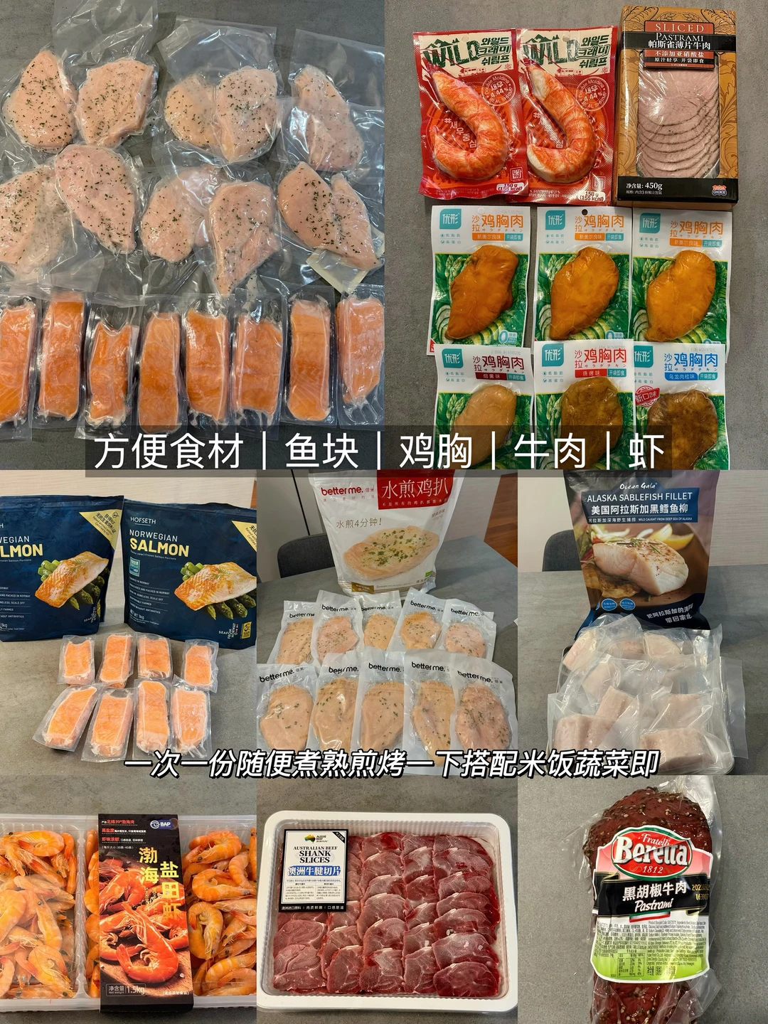 这些三文鱼快、鸡排、牛肉、虾都是随便煎煮一下就OK的很好吃也很简单小白也能搞定