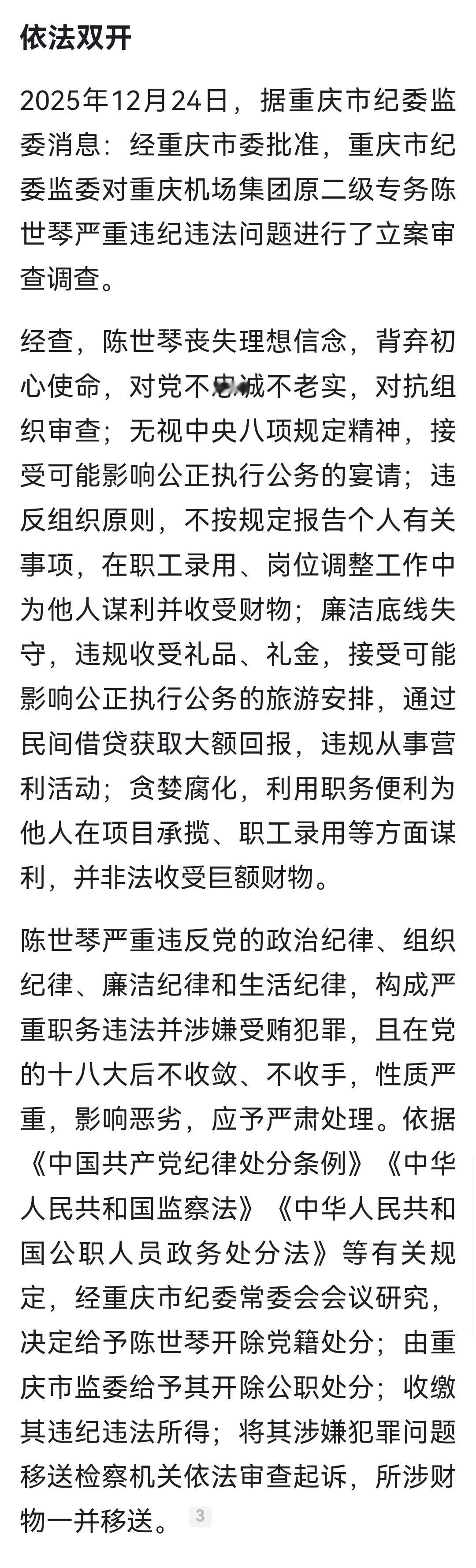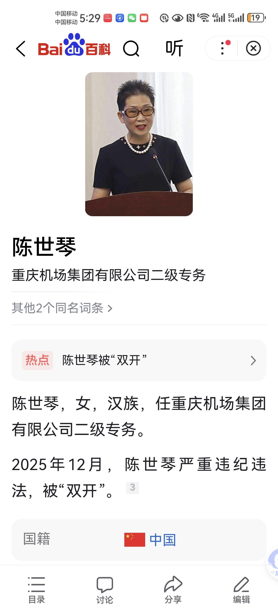 重庆机场集团的陈世琴,今天彻底栽了。 这个陈世琴也不简单,她平日里的穿着打扮十分讲究,也很有特色。喜欢穿品牌衣服,喜欢戴珠宝,看起来也是珠光宝气。 一身打扮也是特别,头发剪得特别短,平日里喜欢戴着一副深色眼镜,脸上画着精致的妆容,不管是外出还是开会,口红都擦得锃亮。 虽然已经50岁往上,但是平日里很注重护肤,保养得当,看起来远比实际年龄要显年轻。 她是1967年生人,拥有大学学历,还是一名高级会计师。 曾经在重庆机场集团有限公司工作多年,也是一步一步走上高管位置,此前担任过重庆机场集团有限公司党委委员、副总经理。 落马之前曾担任重庆机场集团有限公司二级专务。 和她同日落马的,还有重庆机场集团有限公司原二级专务李光彩。 其实她早在今年7月9日,就已经官宣落马。 如今历时5个多月,也终于将她的问题查清楚了。 她作为国企高管,本应该在履职期间,利用自己的所学所知,为国有企业的健康发展添砖加瓦,然而她并没有做到,反而是在履职期间,廉洁底线失守,利用手中的权力,在职工录用、岗位调整工作中为他人谋利并收受财物,而且还通过民间借贷获取大额回报,违规从事盈利活动,贪婪腐化,利用职务便利,为他人在项目承揽,职工录用等方面谋利,并非法收受巨额财物。 通报之中用了“巨额”一词,可见这女人,胃口不小,欲壑难填。 如今也终因为自己的贪婪欲望,彻底的付出了代价,于今日被官宣“双开”,相信用不了多久,她也将会被法庭公开宣判,未来等待她的,将是悠悠的牢狱时光。