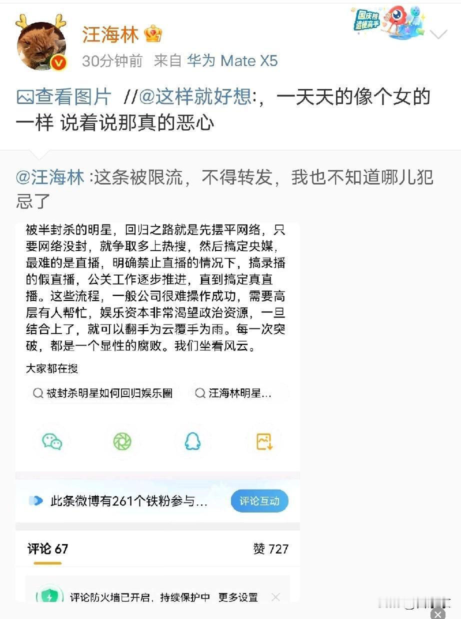 汪海林指名道姓开撕肖战粉丝,这波火药味十足!他最新发文一点没客气,不仅直接点名肖战粉丝,配图还带上了肖战本人,并形容对方行为一天天的像个女的一样说着说那真的恶心。 这相当于公开把以往的隔空讨论,一下子升级成了正面喊话,场面顿时变得热辣辣。 一方是圈内敢说的编剧,另一方是内娱顶流的庞大粉丝团,两边积攒已久的观点碰撞,这次算是找到了一个集中的爆发点。 这种指名道姓的交流方式,在讲究场面话的娱乐圈里,确实相当少见,也让看客们直呼这次玩真的了。 说到底,公开表达和私下吐槽性质完全不同。