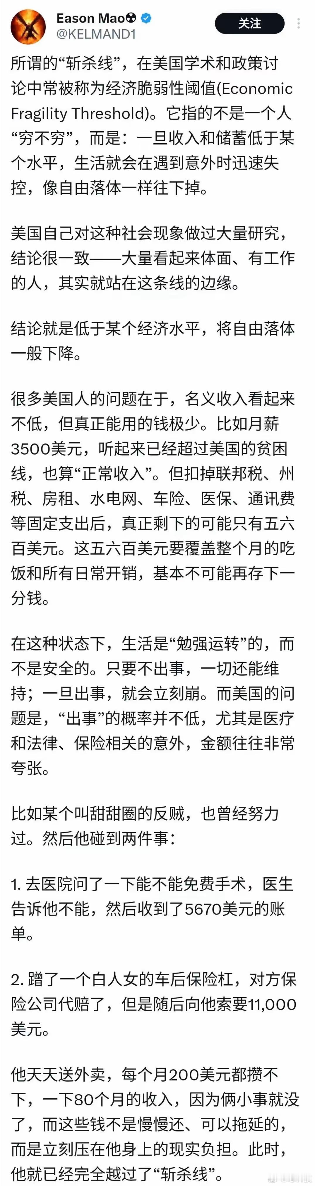 中国网友在红迪论坛向美国网友询问“美国斩杀线”是否存在。大量美国网友称虽然没听说