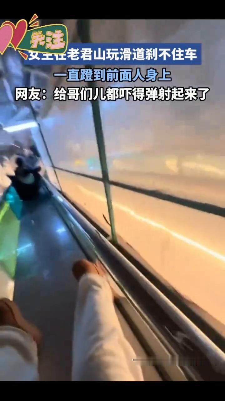 老君山玩滑道刹不住车,一直蹬到前面人身上。 网友:给哥们儿都吓得弹射起来了。 女生在老君山玩滑道刹不住车。