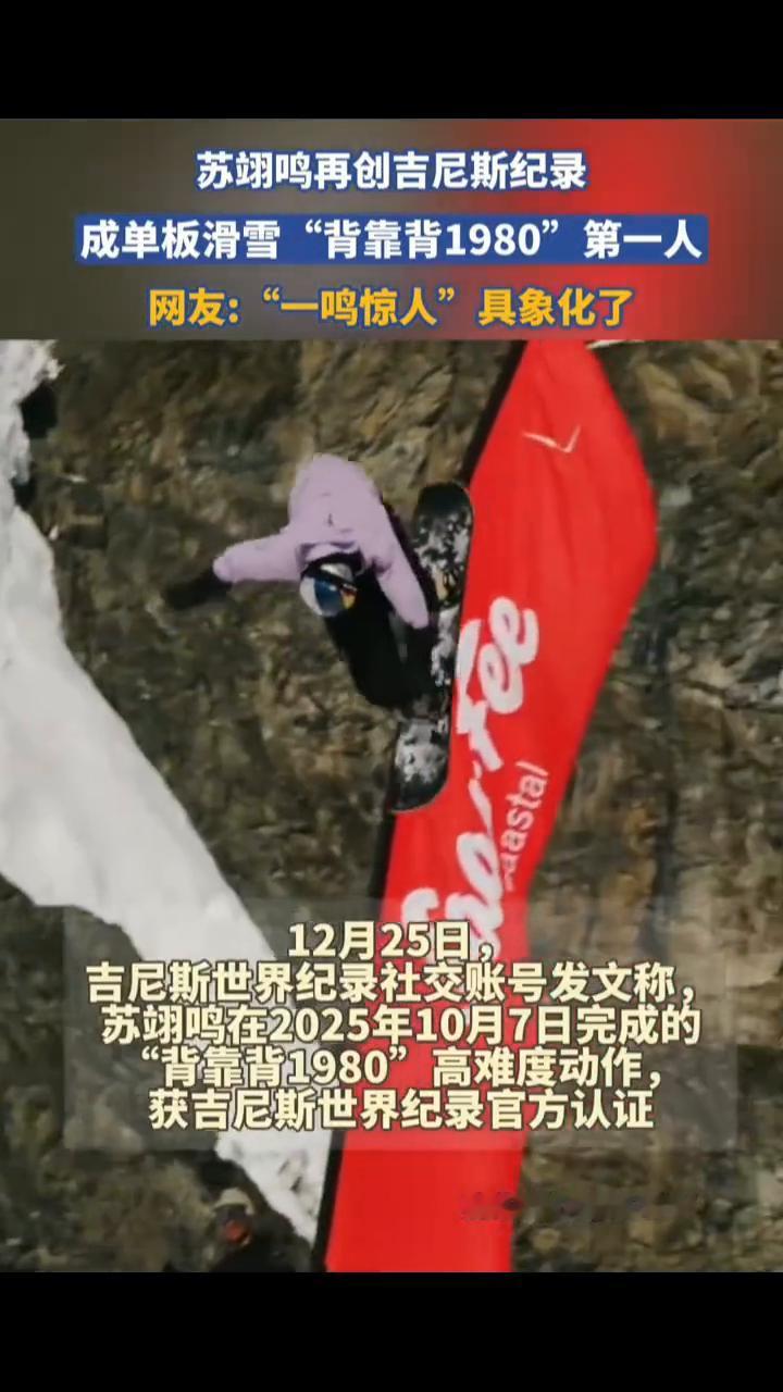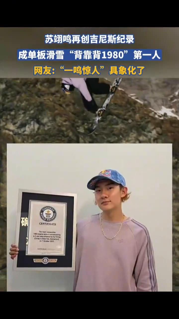 苏翊鸣再创吉尼斯纪录,成单板滑雪"背靠背1980"第一人。网友:"一鸣惊人"具象化了。 苏翊鸣在2025年10月7日完成的"背靠背1980"高难度动作,确认其创造了"一次连贯滑行内完成单板滑雪1980度转体次数最多"的吉尼斯世界纪录。 恭喜苏翊鸣,祝福他在2026年米兰-科尔蒂纳冬奥会继续绽放光彩。其刻苦训练和敢于创新的精神备受认可,也为年轻一代树立了榜样,太厉害了。