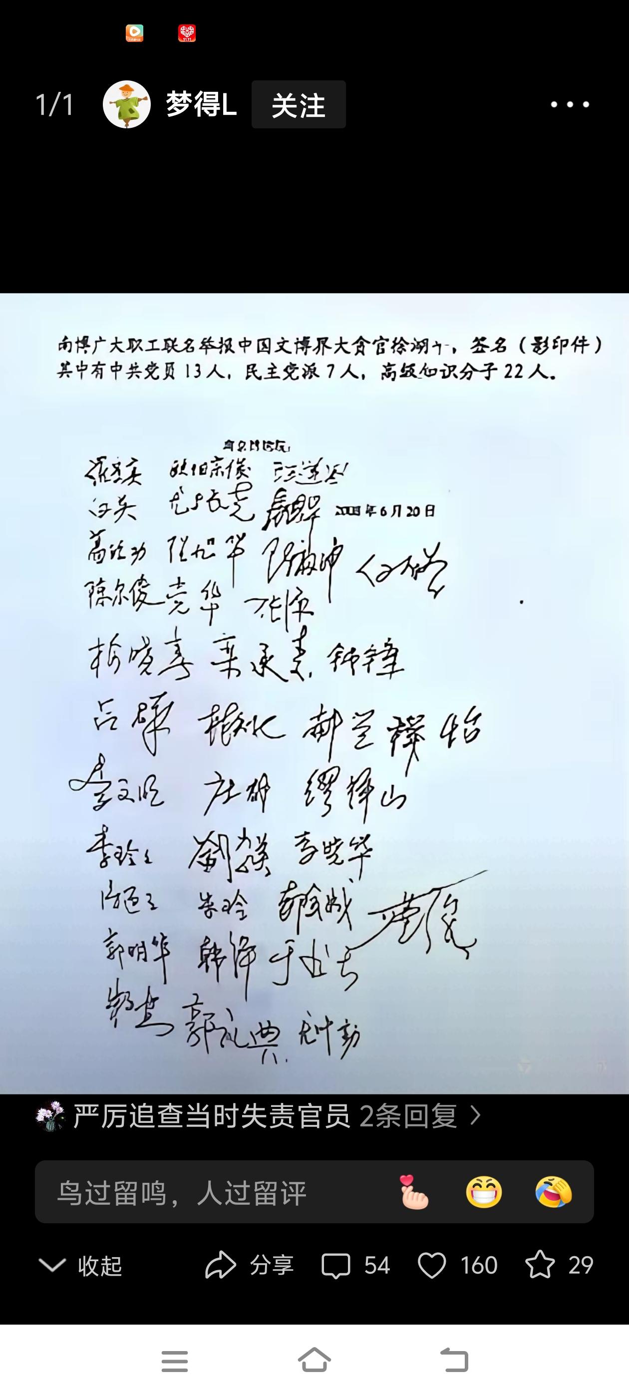 42人签名的字体怎么都如出一辙呢??? 网传的南京博物院42人实名举报原院长徐湖平的材料让人震惊! 在体制内实名举报本单位大领导的比较少,况且这是42人联名举报。 我仔细看了一下这个联名举报的签字,感觉这些名字好像是一个人的字体呢??? 大家看看是不是书写签名是不是一个人的字?