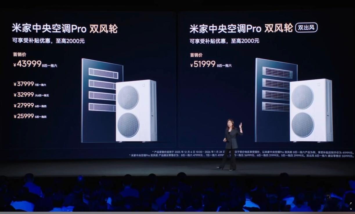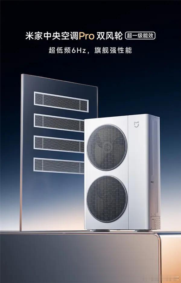 2025年空调行业的年底压轴产品,米家中央空调Pro携“双风轮核弹”成为行业新的天花板!米家中央空调Pro双风轮作为小米首款自产的中央空调,采用创新的双出风设计,在超一级能效、超低频运转、超长期连续制冷、超低温波动性、宽温域运行、自蓄热化霜等方面均有优秀表现,总风量提升至1500m³/h以上,送风距离延长至15米,能覆盖190㎡空间。米家中央空调Pro的分层送风设计,制冷时,冷风从上层风口吹出自然下沉覆盖房间;制暖时,暖风吹向地面,避免热空气停在天花板造成浪费,制暖速度快3倍。另外,搭载米家中央空调除醛的滤网,在调节室内温度的同时,能帮助去除甲醛,改善室内空气质量。 米家中央空调Pro双风轮不同匹数价格不同, 从5匹到8匹都有,价格覆盖25999-51999元。