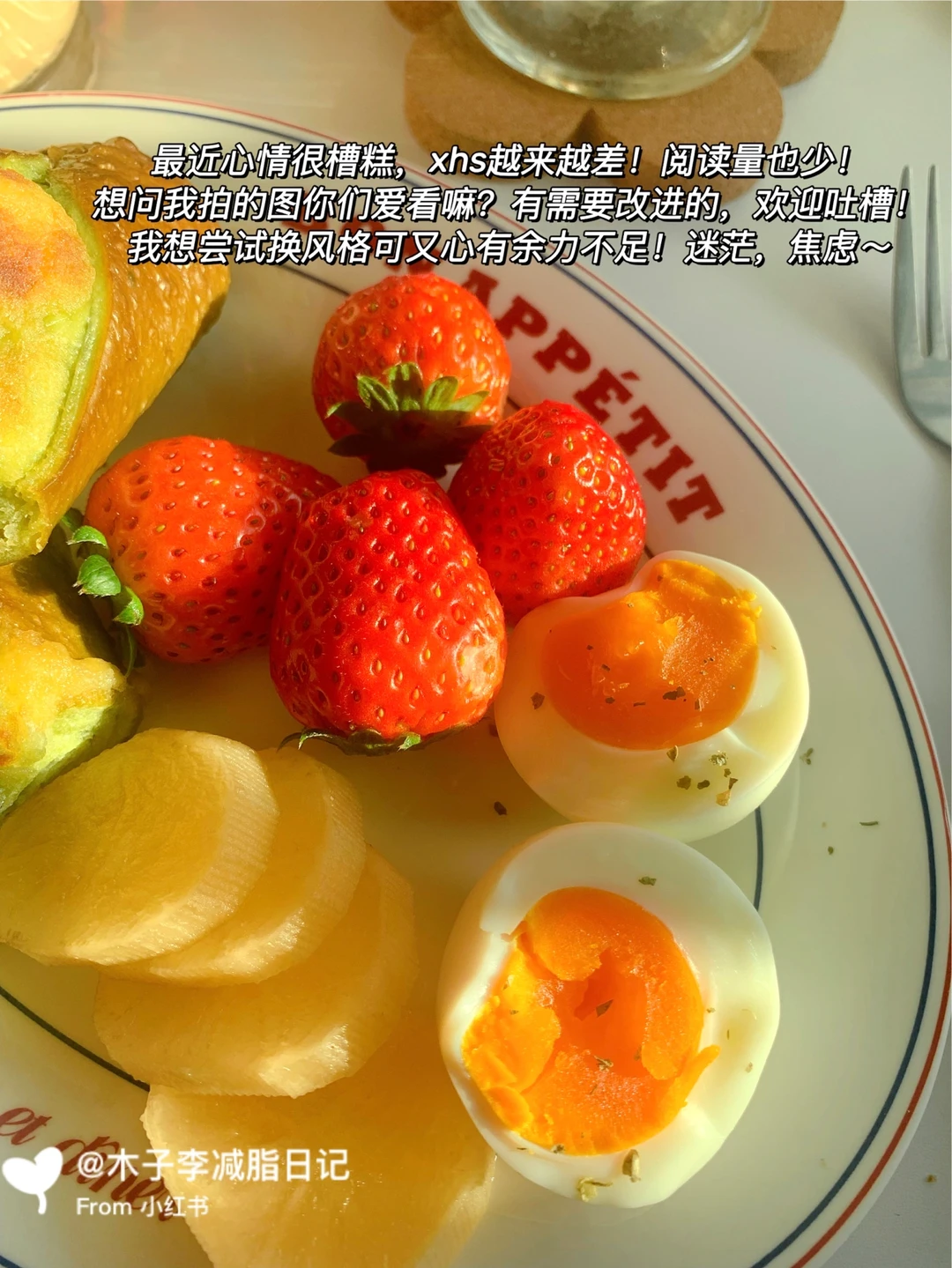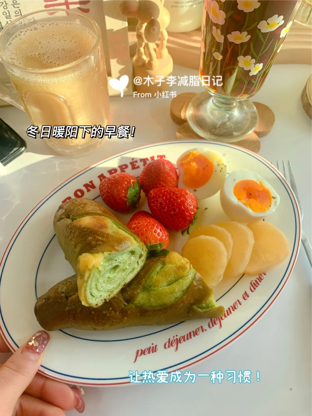 🍳早餐:抹茶碱水➕鸡蛋➕草莓🍓➕雪莲果➕冷萃黑咖➕无糖豆浆