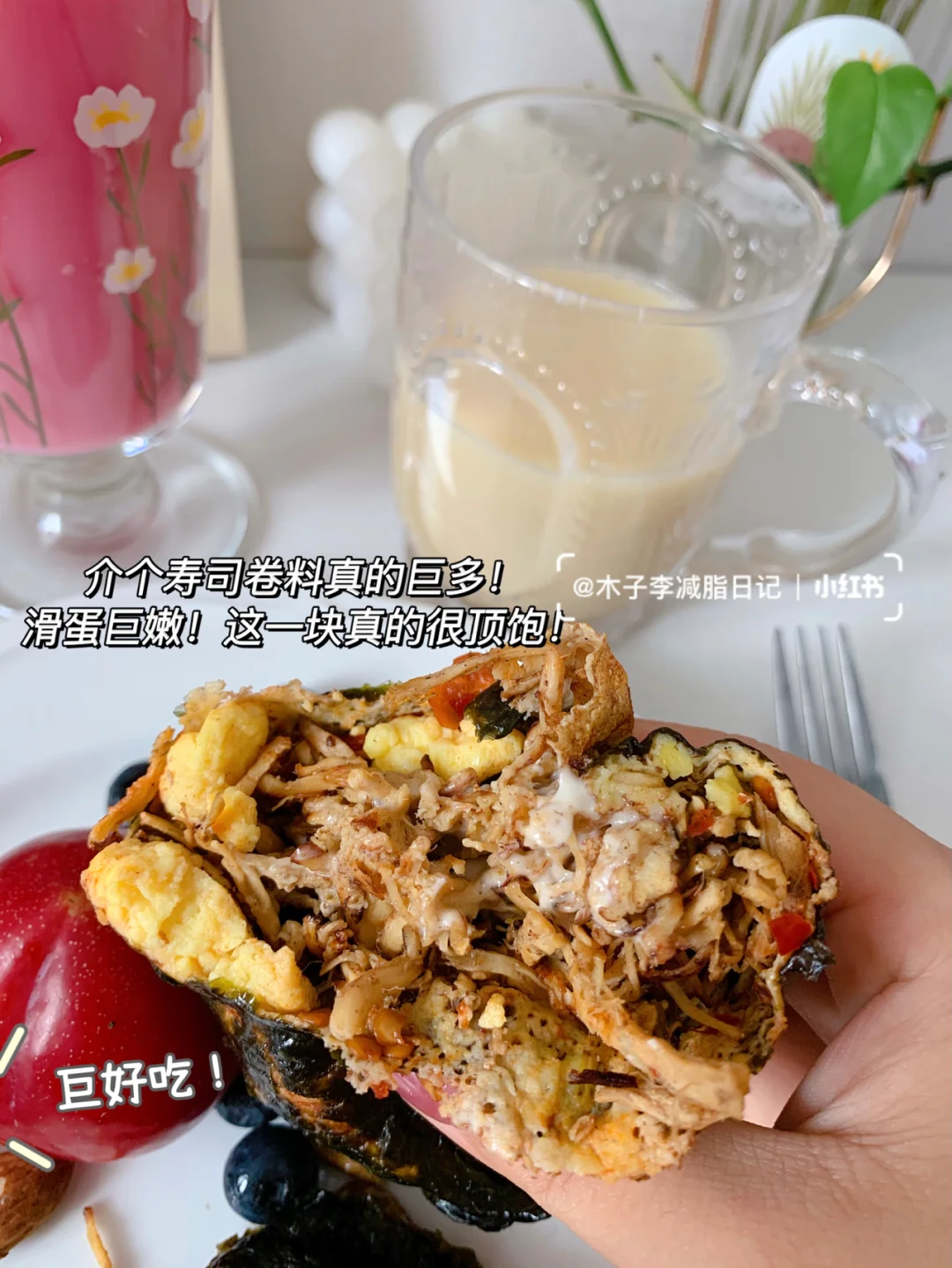 🍳早餐:每日一杯自律豆浆粉➕麻辣鸡丝寿司卷➕蓝莓➕李子➕坚果仁➕蛋白粉➕益生菌
