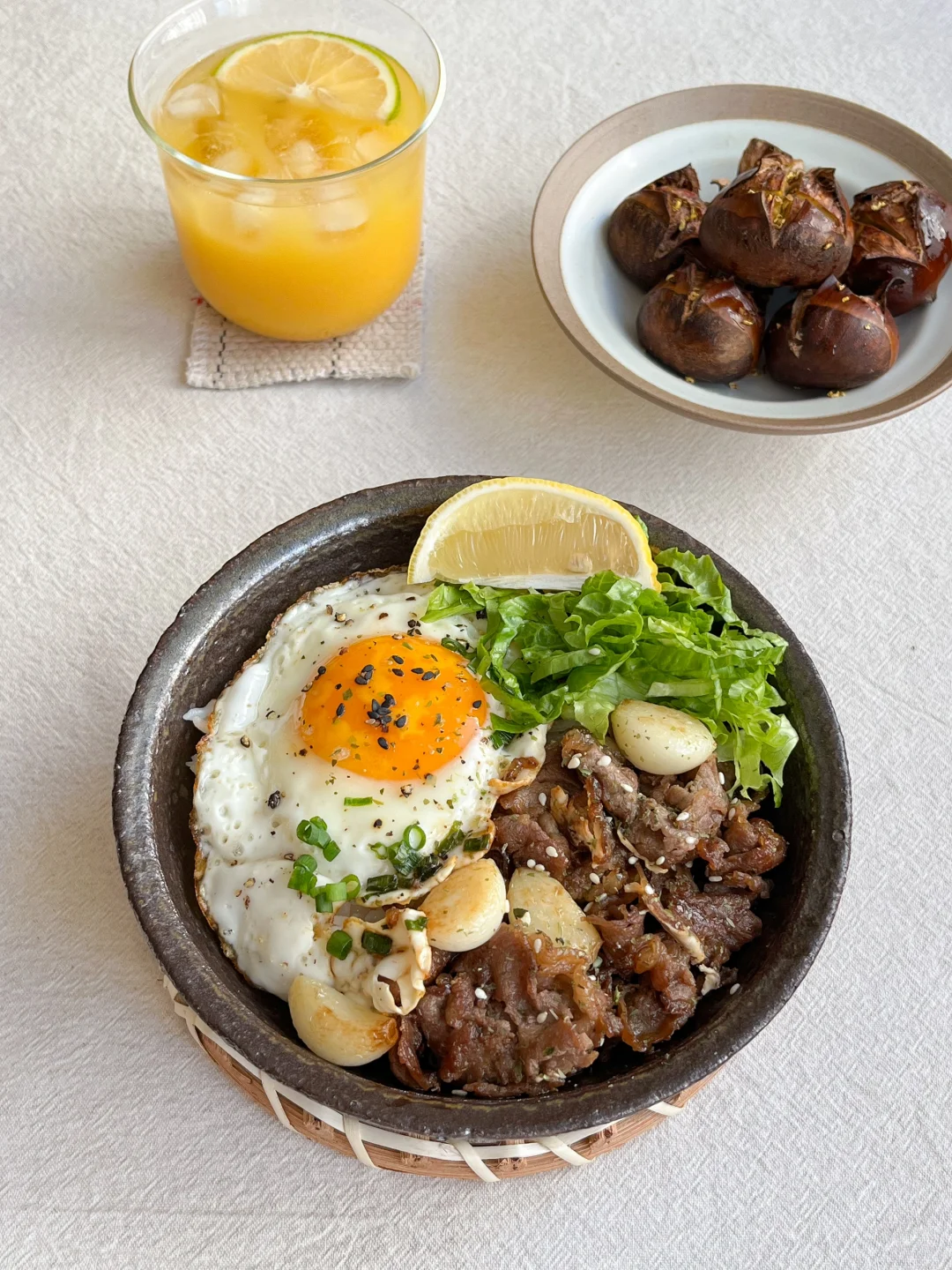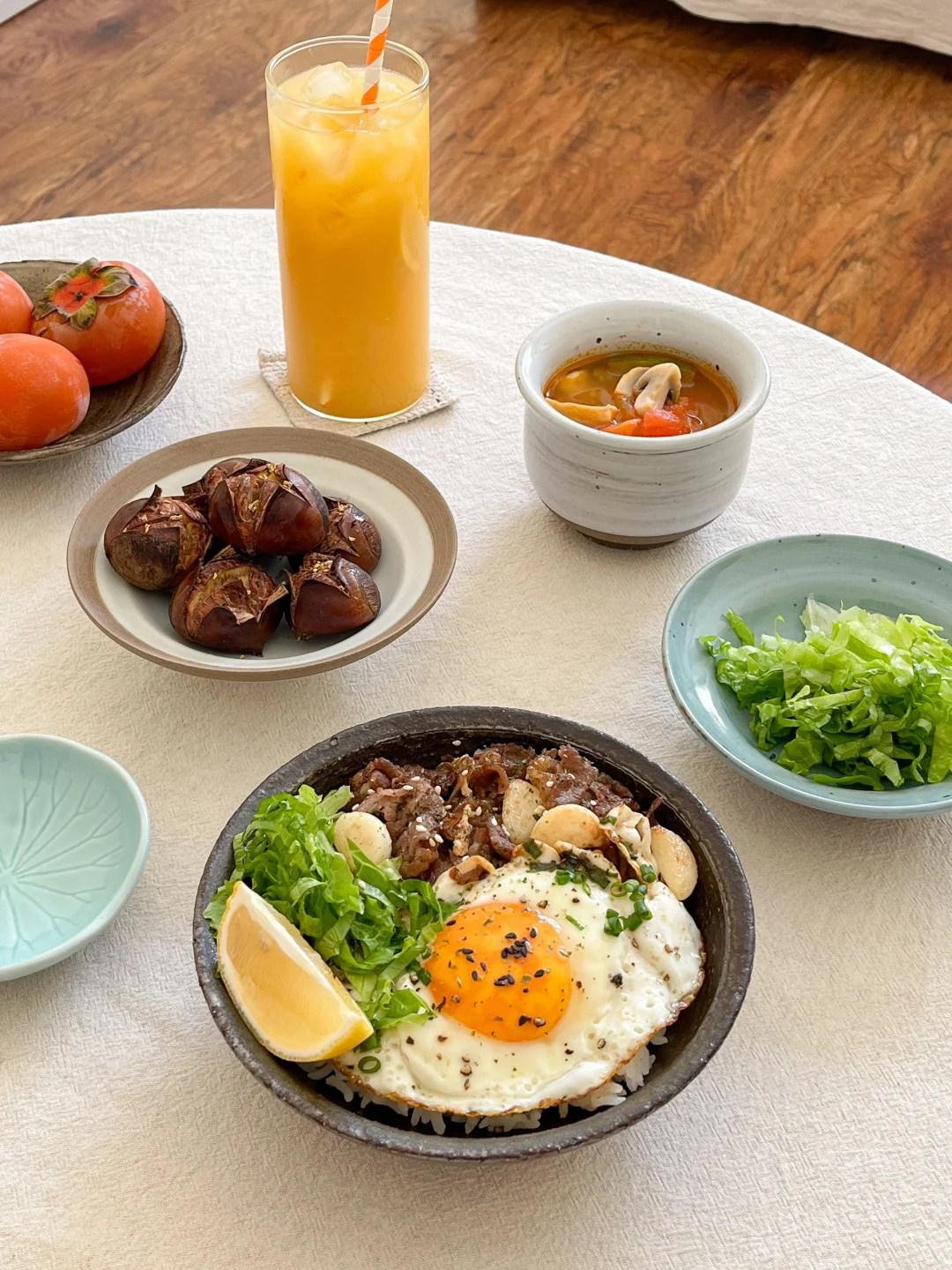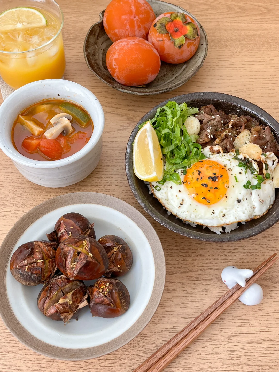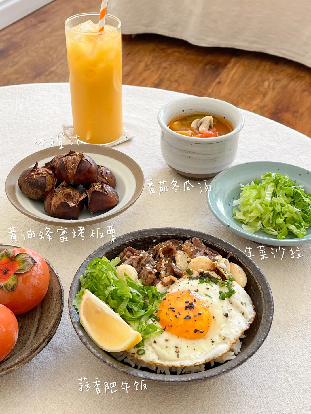 🧾午餐: 蒜香肥牛饭🍛 黄油蜂蜜烤板栗🌰 番茄冬瓜汤🍅 柿子🍁 冰橙汁🍊 好喜欢舒服的秋天 有栗子吃的秋天 前几天去爬山发现板栗落了一地 带着毛刺刺的板栗 好奇捡了一兜子 个头太小 就都煮着吃了 今天发现有买大头板栗 买了一兜烤着吃 🌰黄油蜂蜜烤板栗 在板栗的背上隔十字 加两勺白糖煮15分钟 融化一块黄油 让均匀的板栗裹上 放烤箱180度烤5-10分钟 再刷上蜂蜜水 再烤10分钟 就能闻到满屋的栗子香味了 🍅番茄冬瓜汤 如果觉得冬瓜汤太清淡不好喝 就放一颗番茄 酸溜溜的超开胃